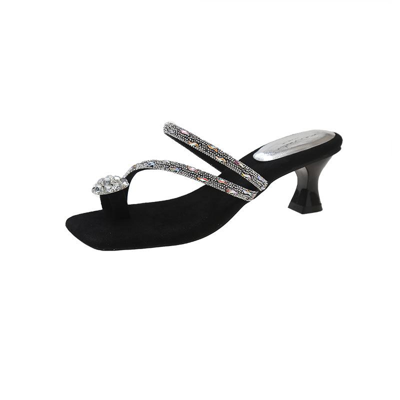 Шлепанцы на среднем каблуке женские новые летние для улицы с юбкой модные на толстом каблуке со стразами крутые шлепанцы