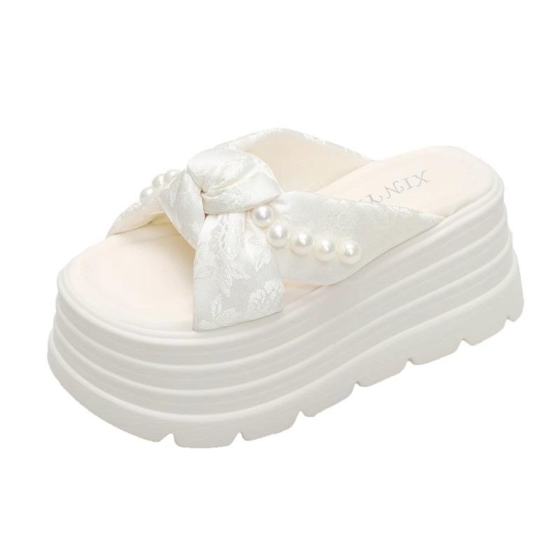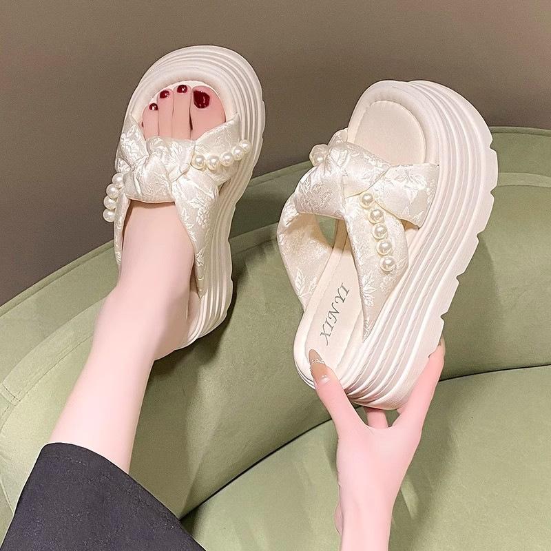 Женские летние 2025 новые жемчужные шлепанцы на толстой подошве с небольшим увеличением роста леопардовый принт пляжные прохладные шлепанцы