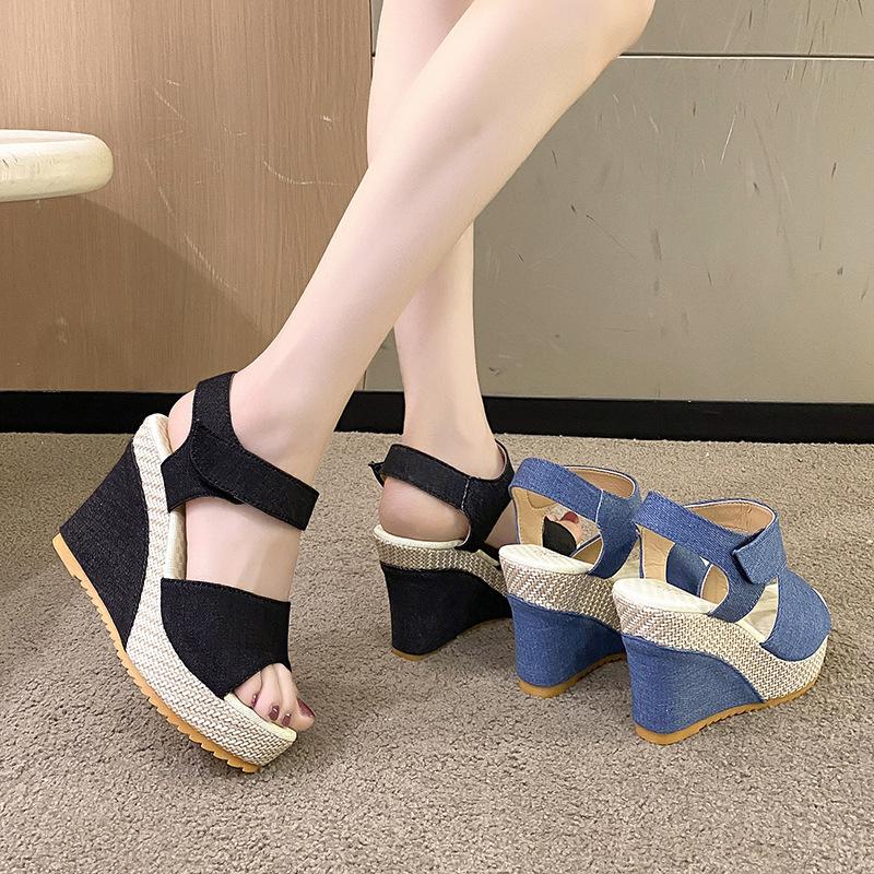 Босоножки на высоком каблуке новые сандалии на танкетке с открытым носком повседневные водонепроницаемые на толстой подошве на липучке женская обувь