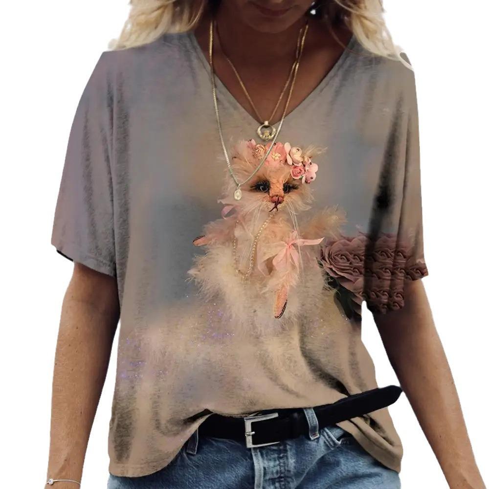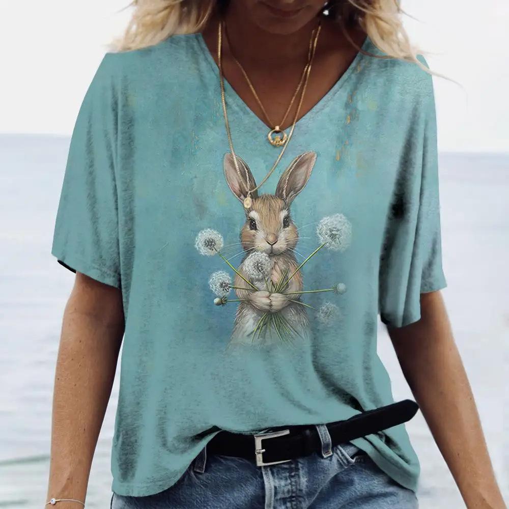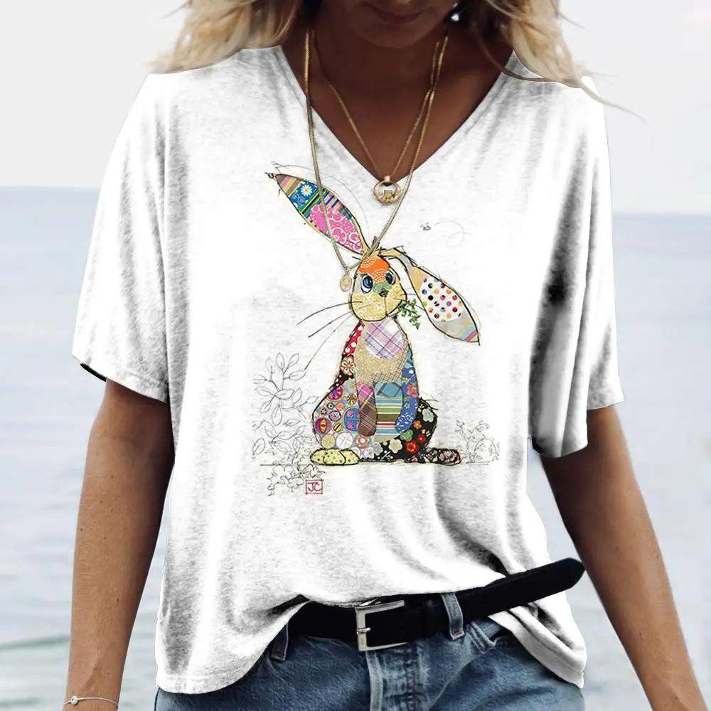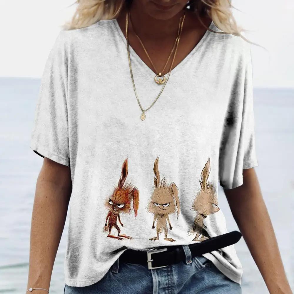 Женская футболка с V-образным вырезом, 3D-принтом, анимированным кроликом, модная футболка с принтом и короткими рукавами
