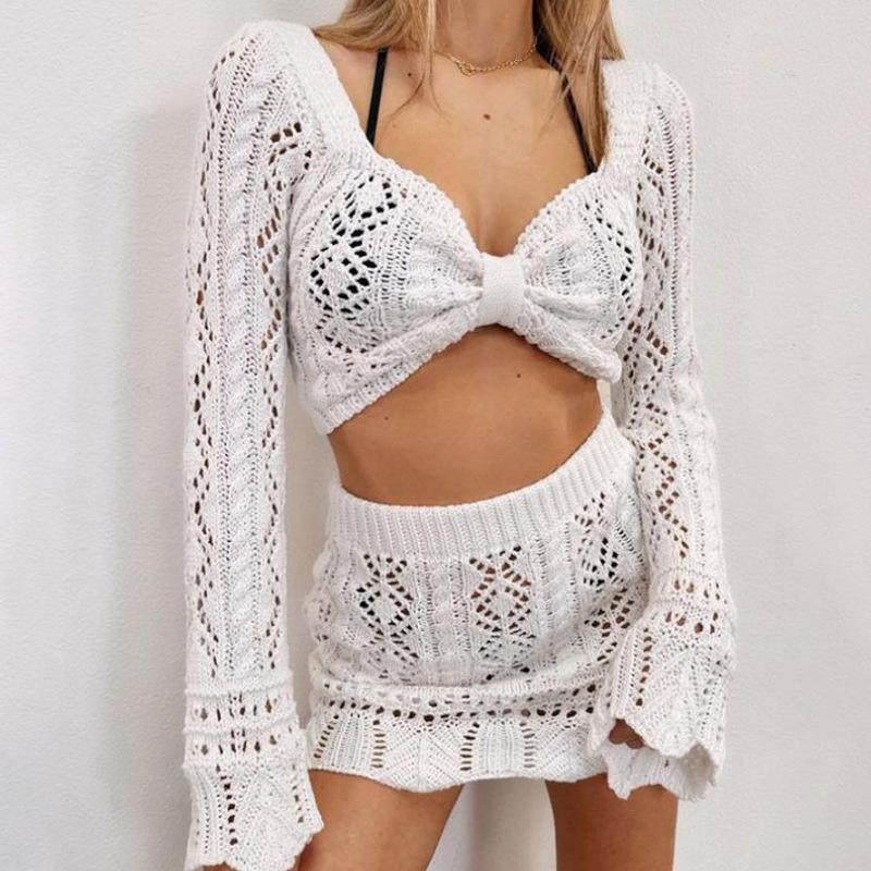 Новая рубашка от солнца для женщин, короткий комплект, вязаный ажурный купальник-бикини, женское платье