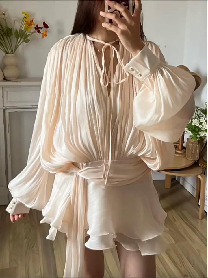 Шикарные платья мини с кружевной шнуровкой, свободного кроя, сексуальные, для женщин, с круглым вырезом, длинными рукавами, минималистичные, с оборками и складками, женская мода