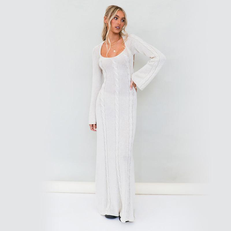 Женское вязаное платье с открытой спиной, пляжная блузка, с длинными рукавами, облегающее, внешняя юбка