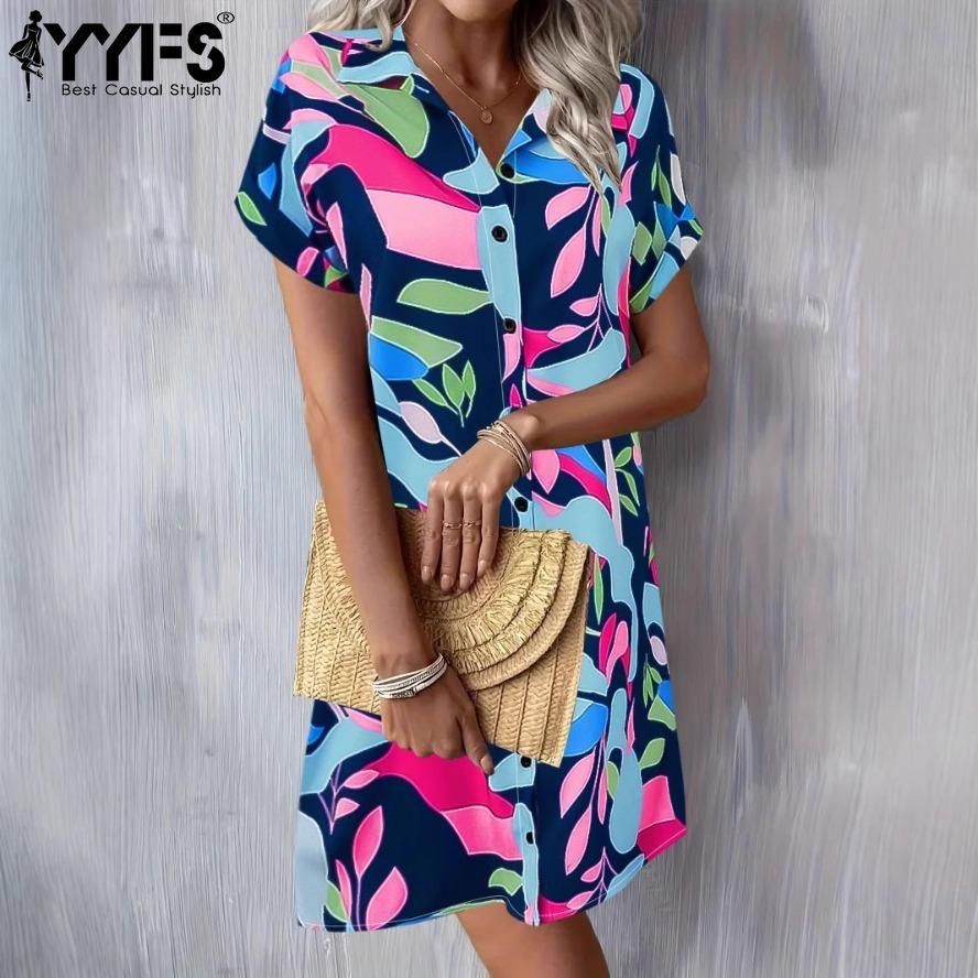 YYFS Женская мода лето весна цвет блок принт короткий рукав поло воротник свободная талия повседневные платья