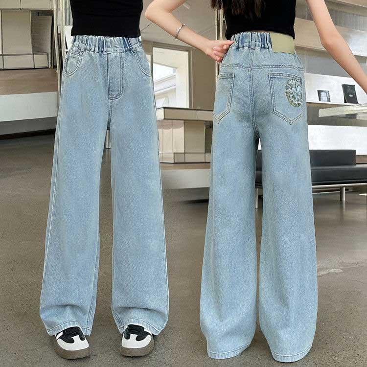 Брюки для девочек Весна и Осень Джинсы с широкими штанинами Модные Корейские брюки с прямыми штанинами и задними карманами