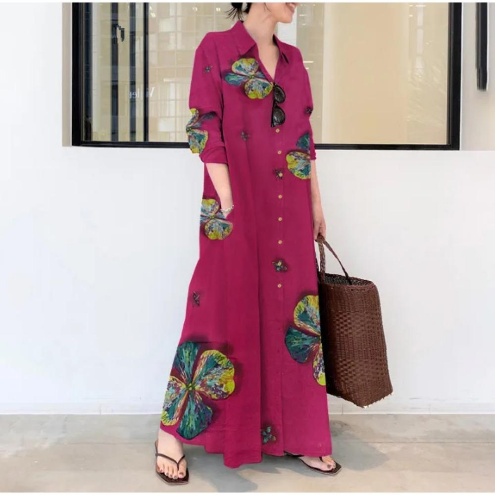 Женское винтажное хлопковое льняное платье, летнее повседневное платье на пуговицах с принтом и длинным рукавом, халат, дамское свободное элегантное платье-рубашка