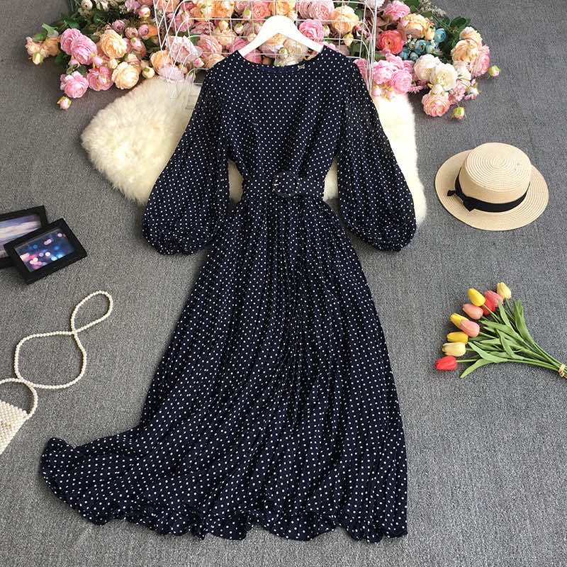 Новое женское длинное платье с длинным рукавом и поясом, элегантное шифоновое платье в винтажном стиле с плиссировкой и большим подолом высокого качества — купить товар онлайн с бесплатной доставкой по всему миру!