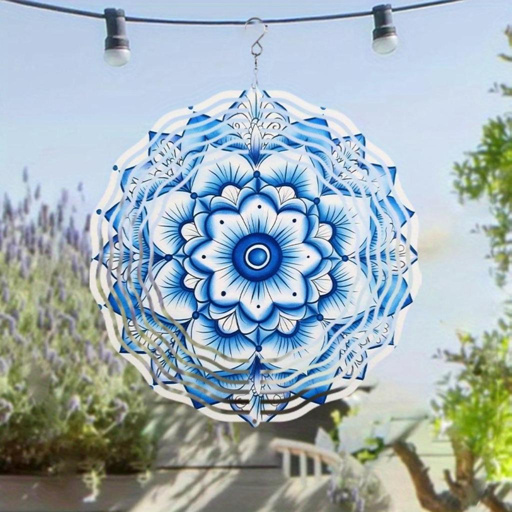 2D Mandala Flower Metal Wind Spinner - Blue & White Kinetic Hanging Decor for Indoor/Outdoor Use, Perfect Christmas & Thanksgiving Gift