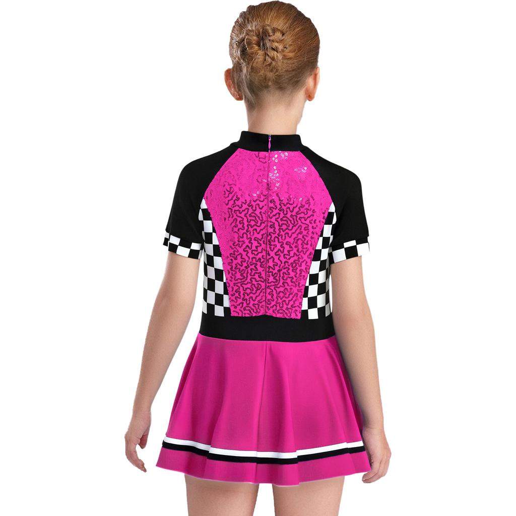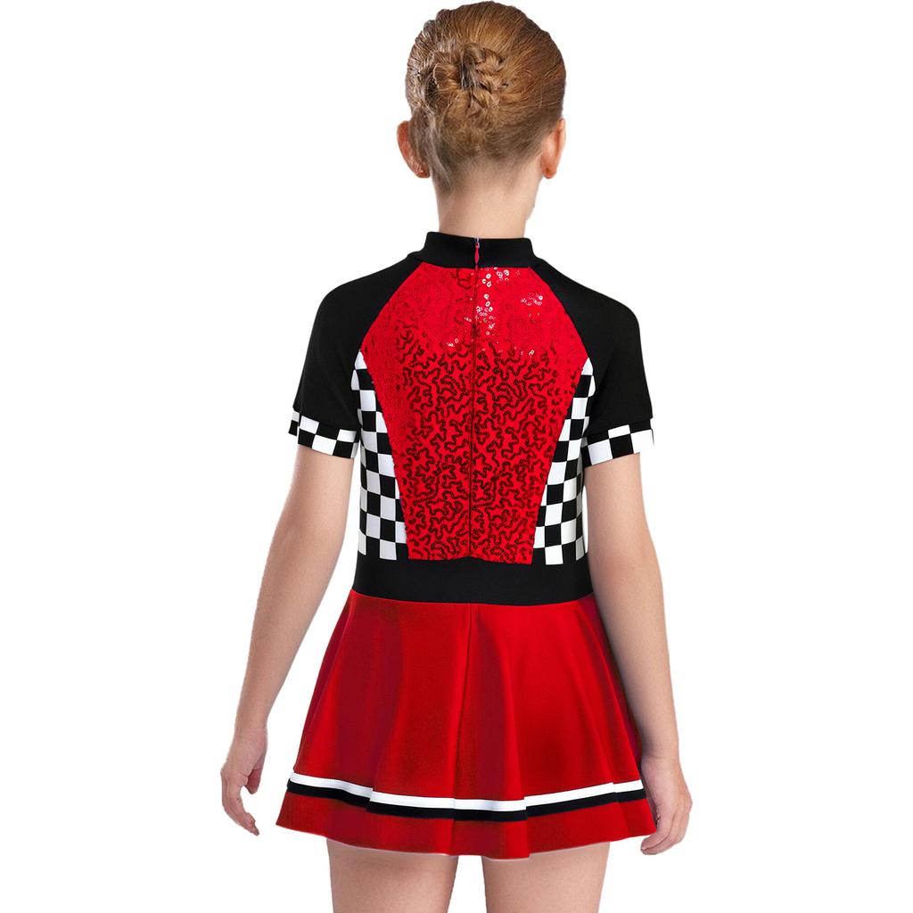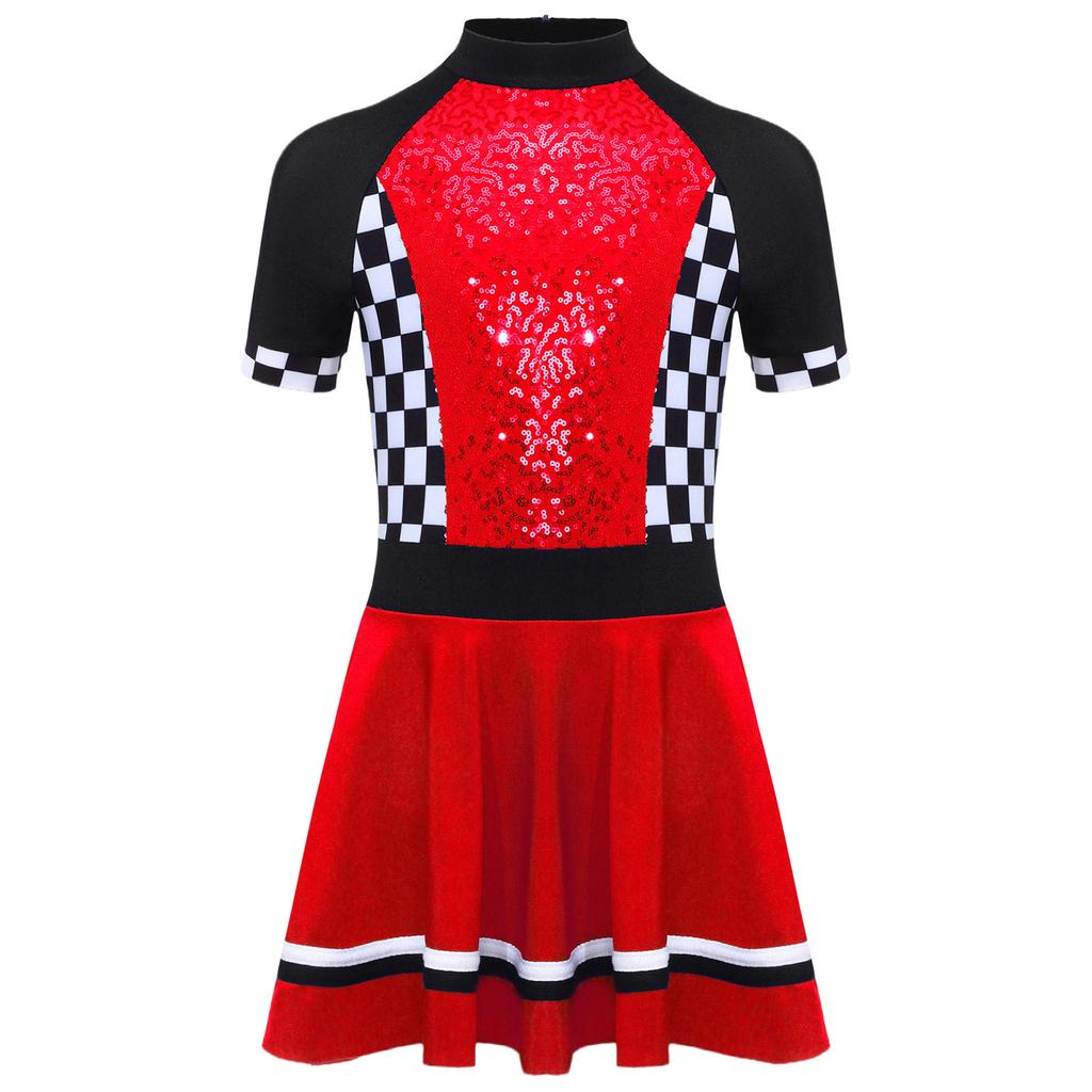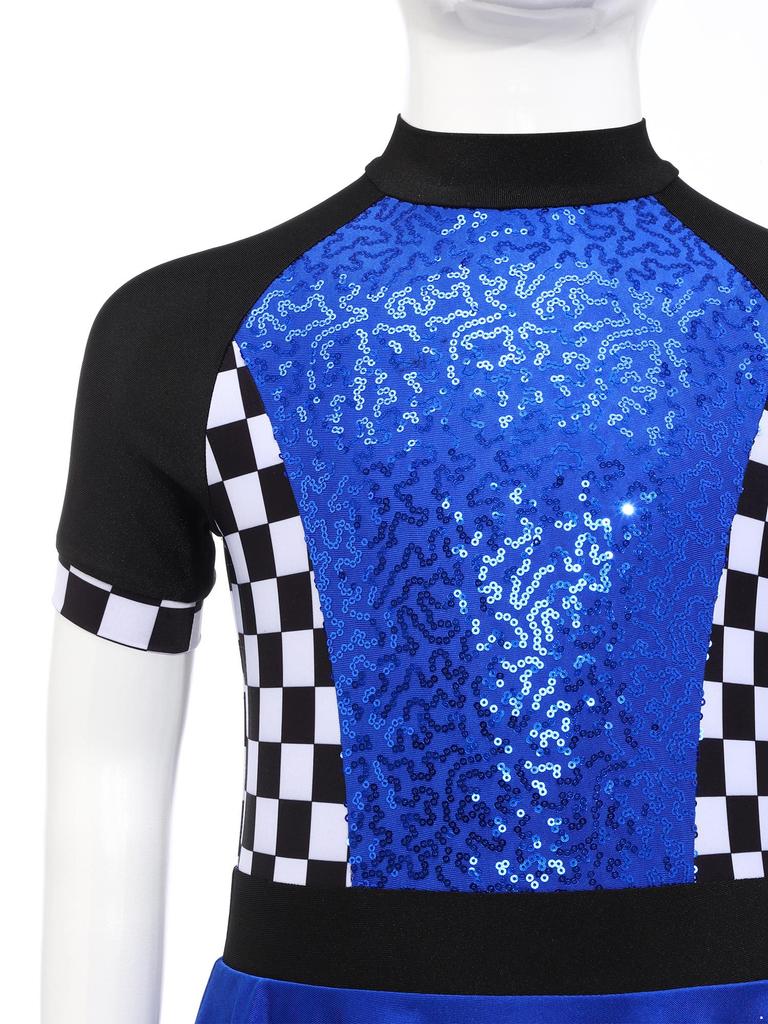 Костюм для гонок для девочек, с воротником-стойкой, с короткими рукавами, на молнии сзади, платье в клетку с пайетками, со встроенными трусиками