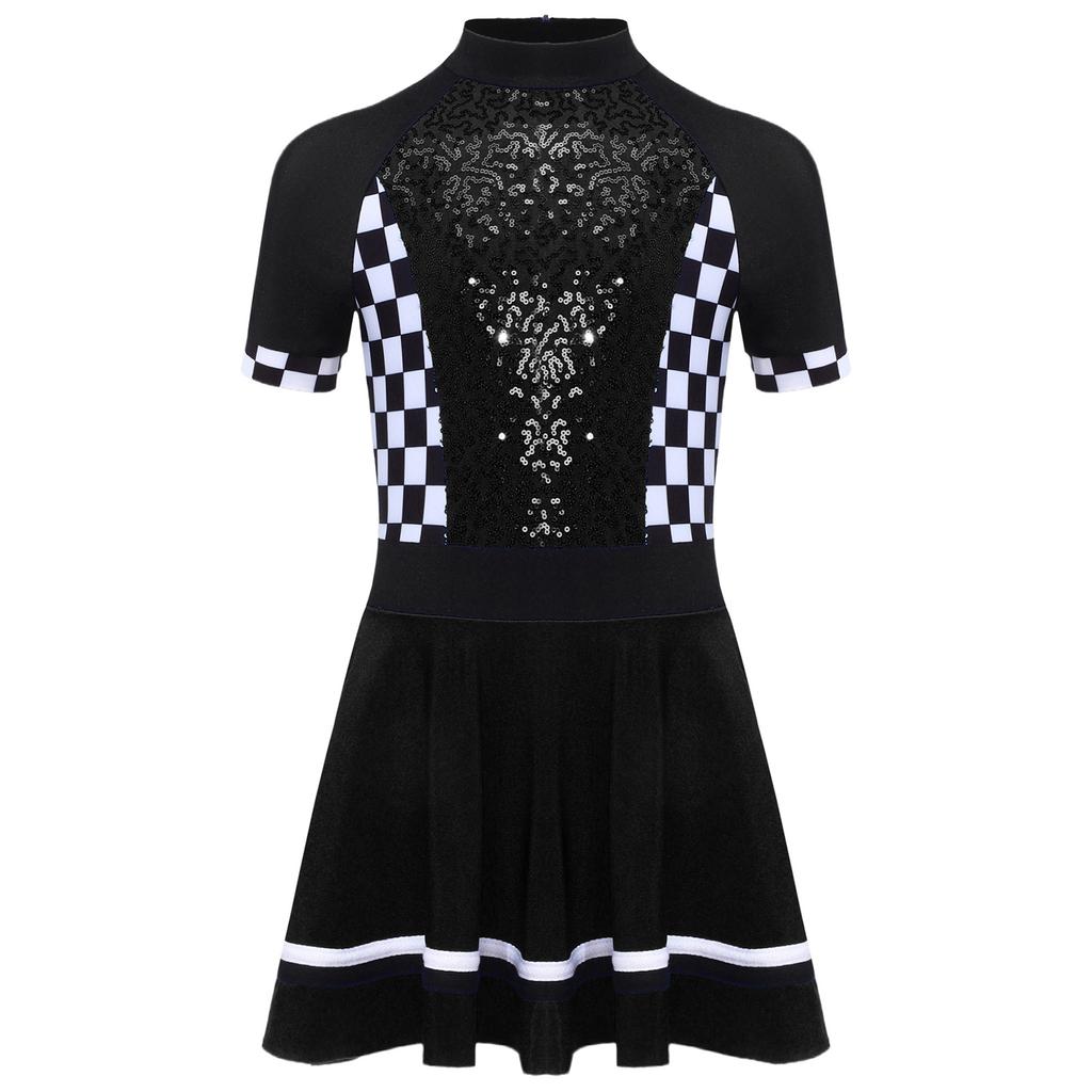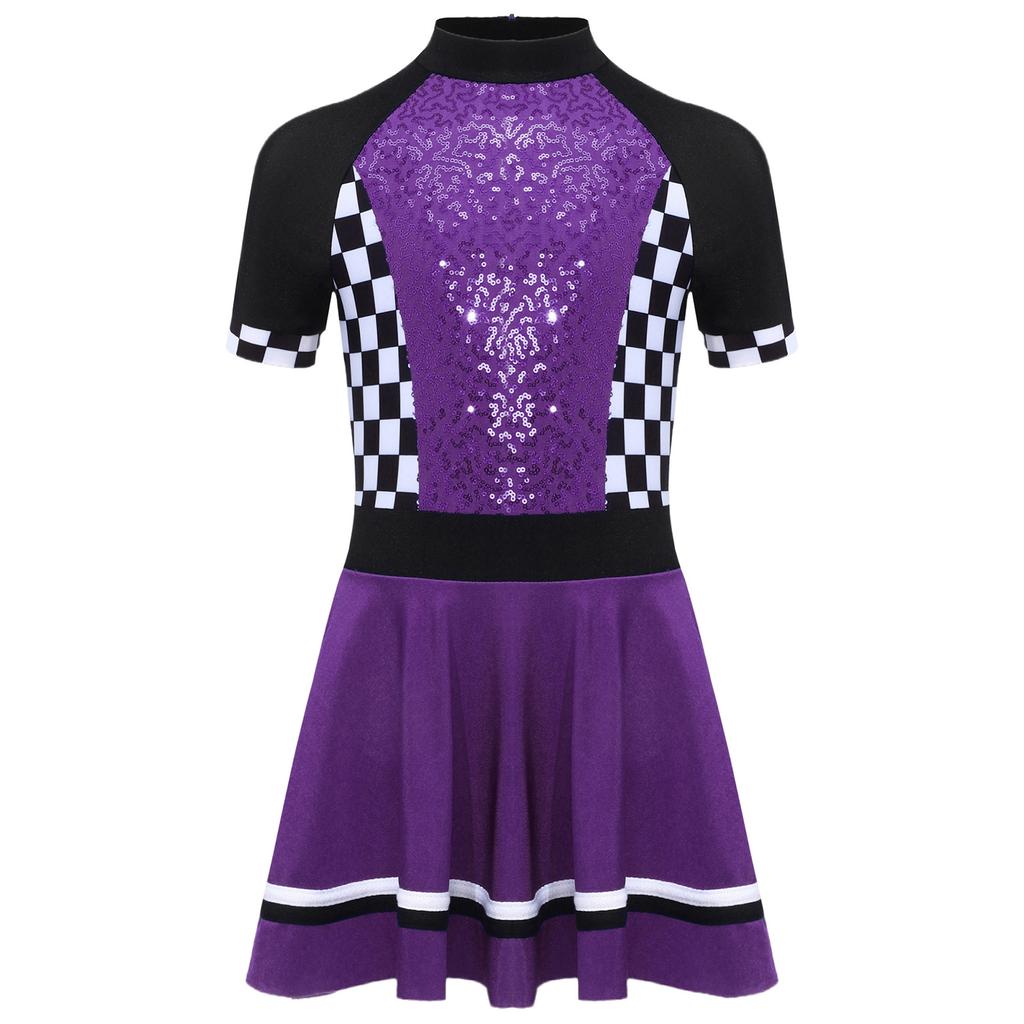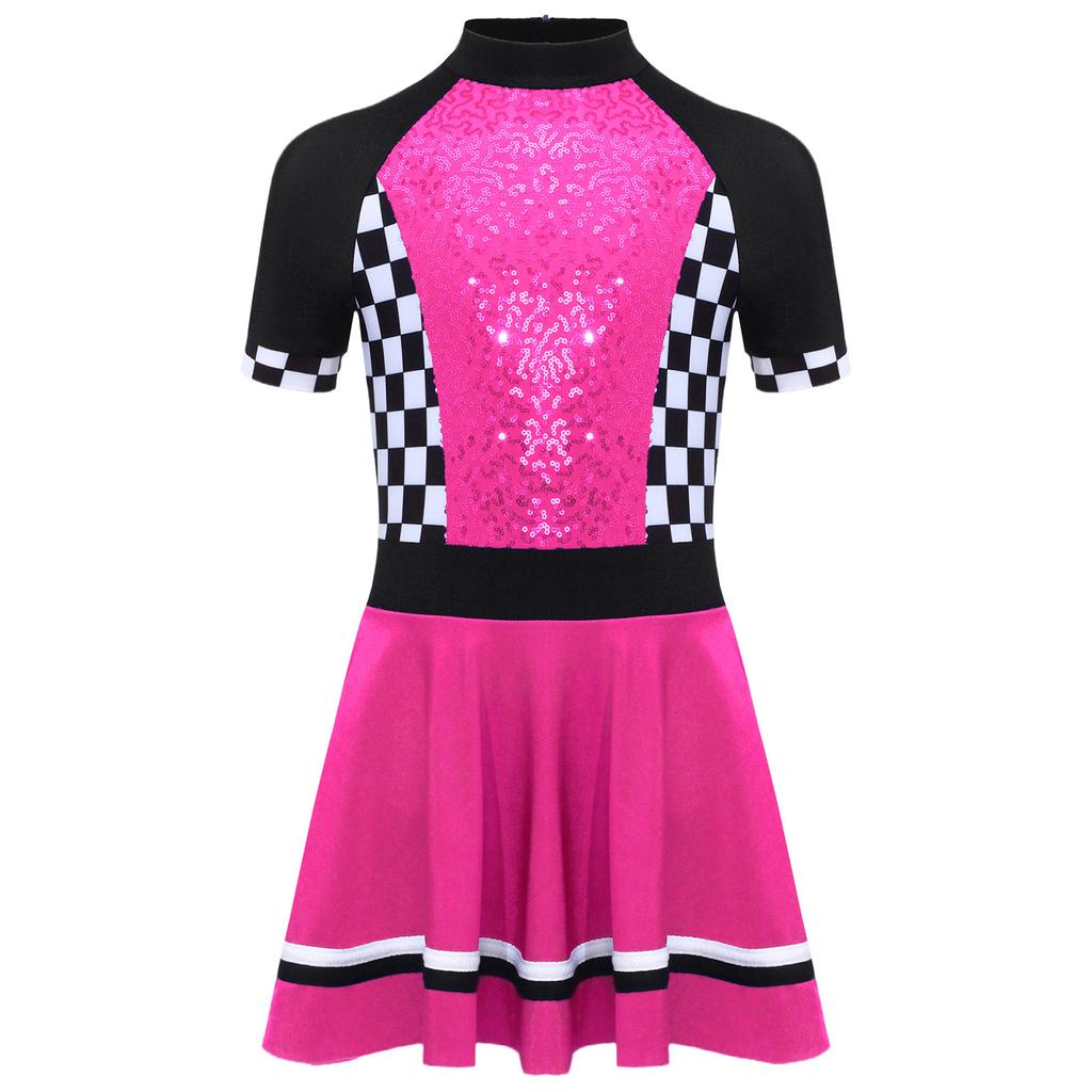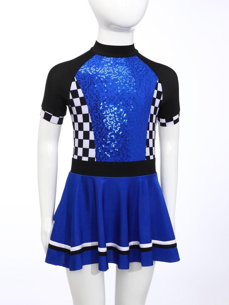 Костюм для гонок для девочек, с воротником-стойкой, с короткими рукавами, на молнии сзади, платье в клетку с пайетками, со встроенными трусиками