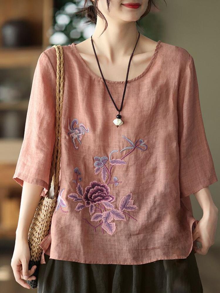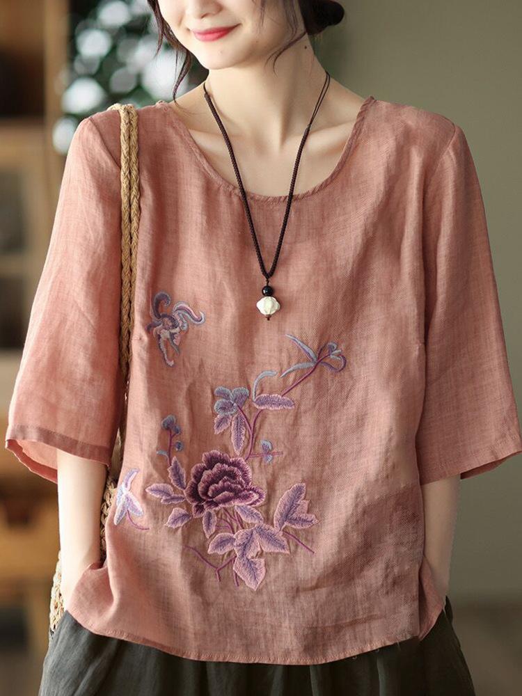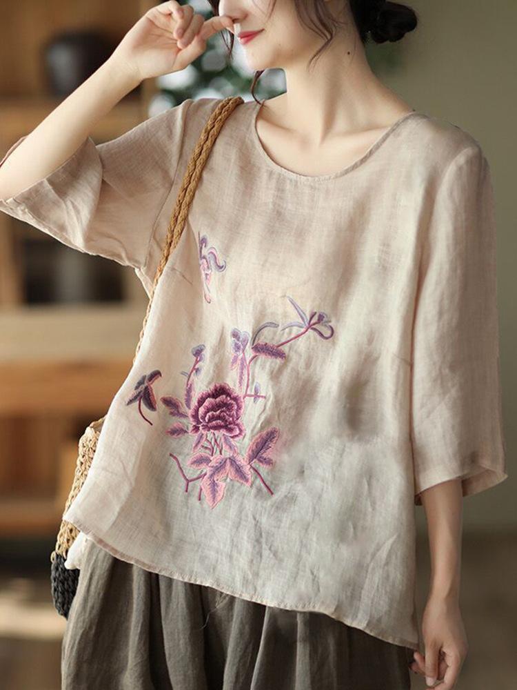 Женская весенняя ретро этническая вышитая футболка с короткими рукавами из хлопка и льна, летние свободные повседневные топы