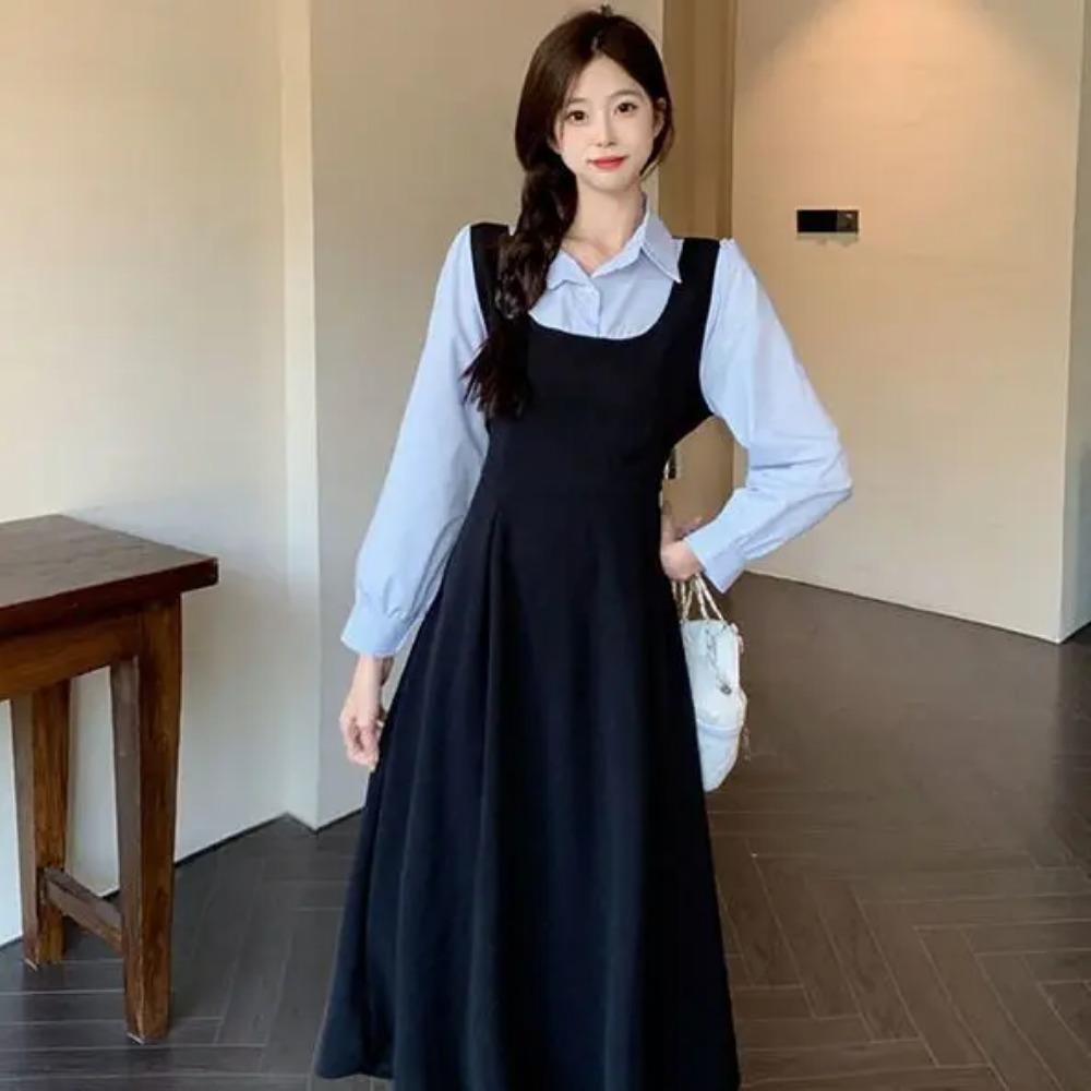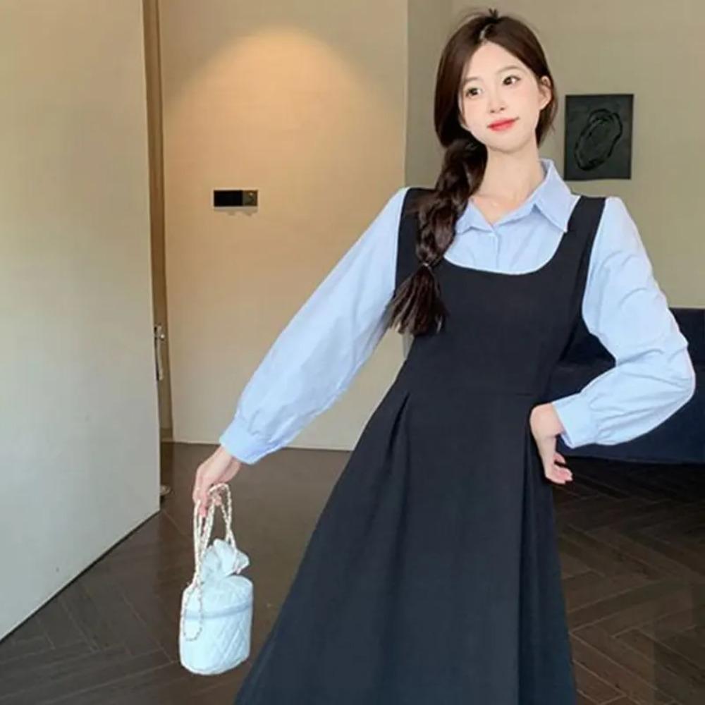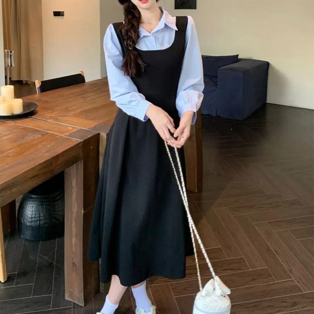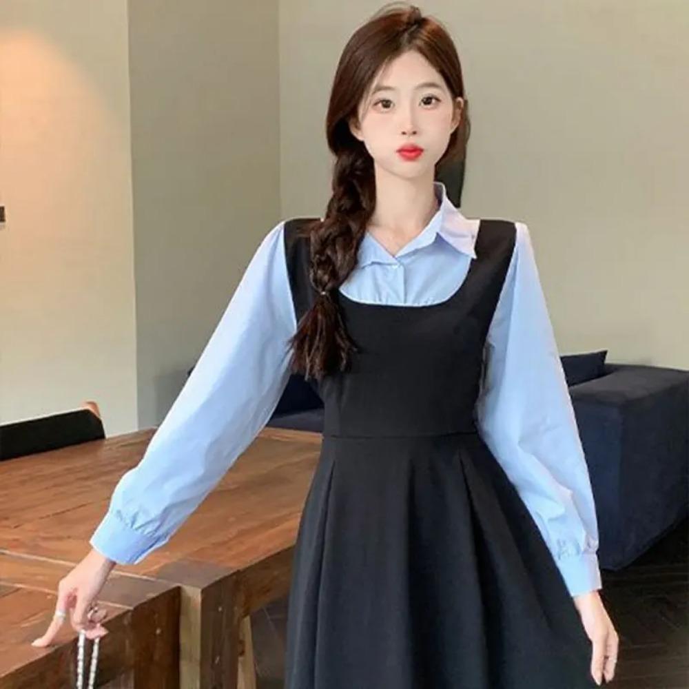 Пэчворк квадратный вырез длинный рукав обманка два платья элегантная мода харадзюку женская одежда повседневный пот все сочетается юбка