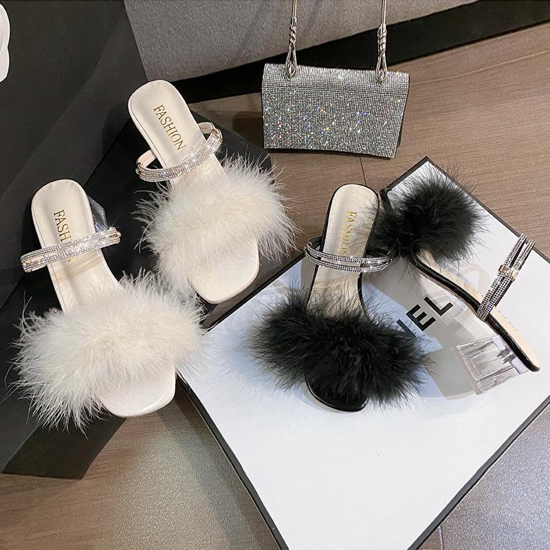 Два кристалла, толстый каблук, пушистые крутые тапочки, женские, лето 2025, новинка, ремешок на одно слово, с юбкой, высокие каблуки