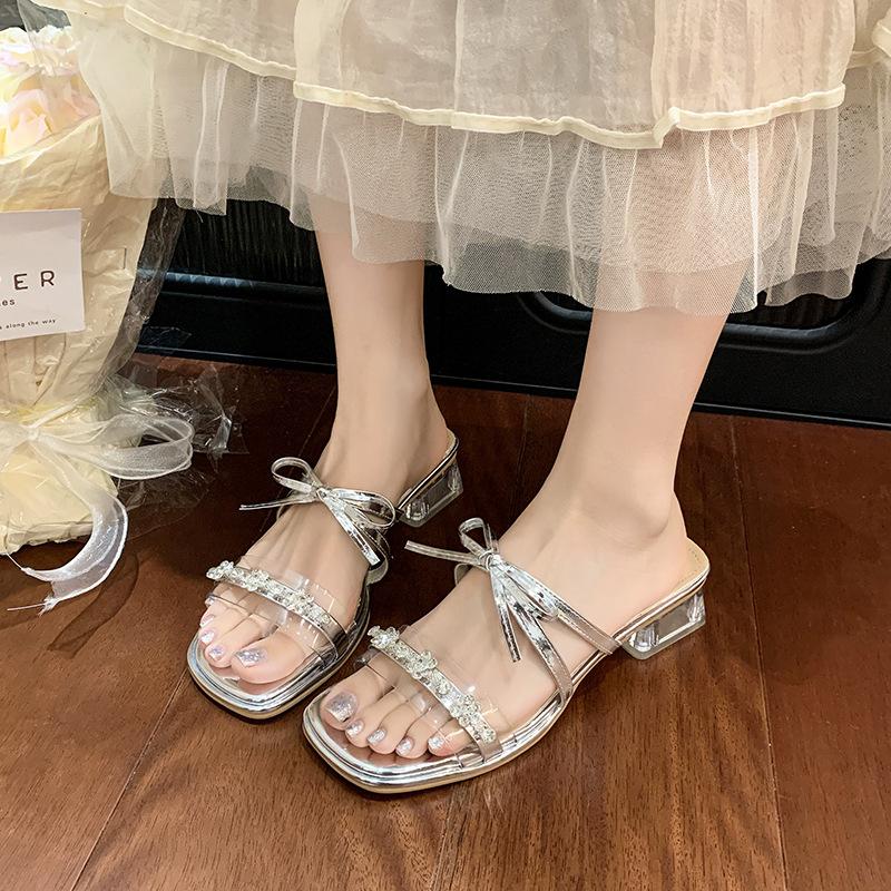 Модные шлепанцы на толстом каблуке, крутые, женские, летние, 2025 новые серебристые сандалии с бантом и стразами, на высоком каблуке