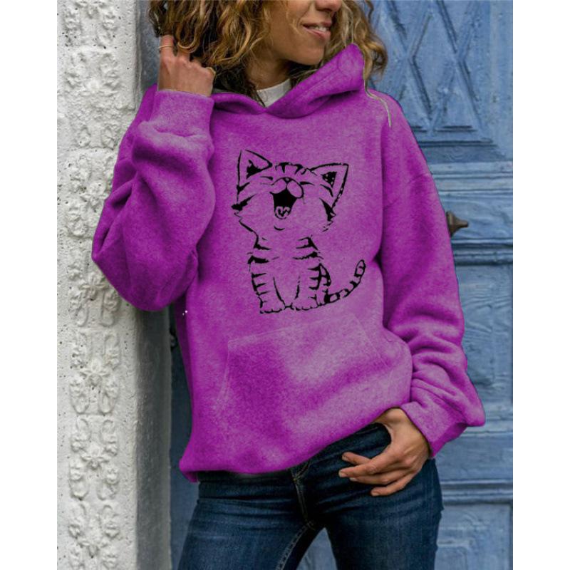 2025 Новый однотонный пуловер свитшот с принтом животных, круглым вырезом, капюшоном и карманом-кенгуру, универсальный повседневный женский топ/пальто