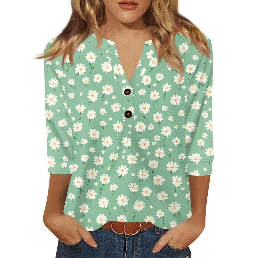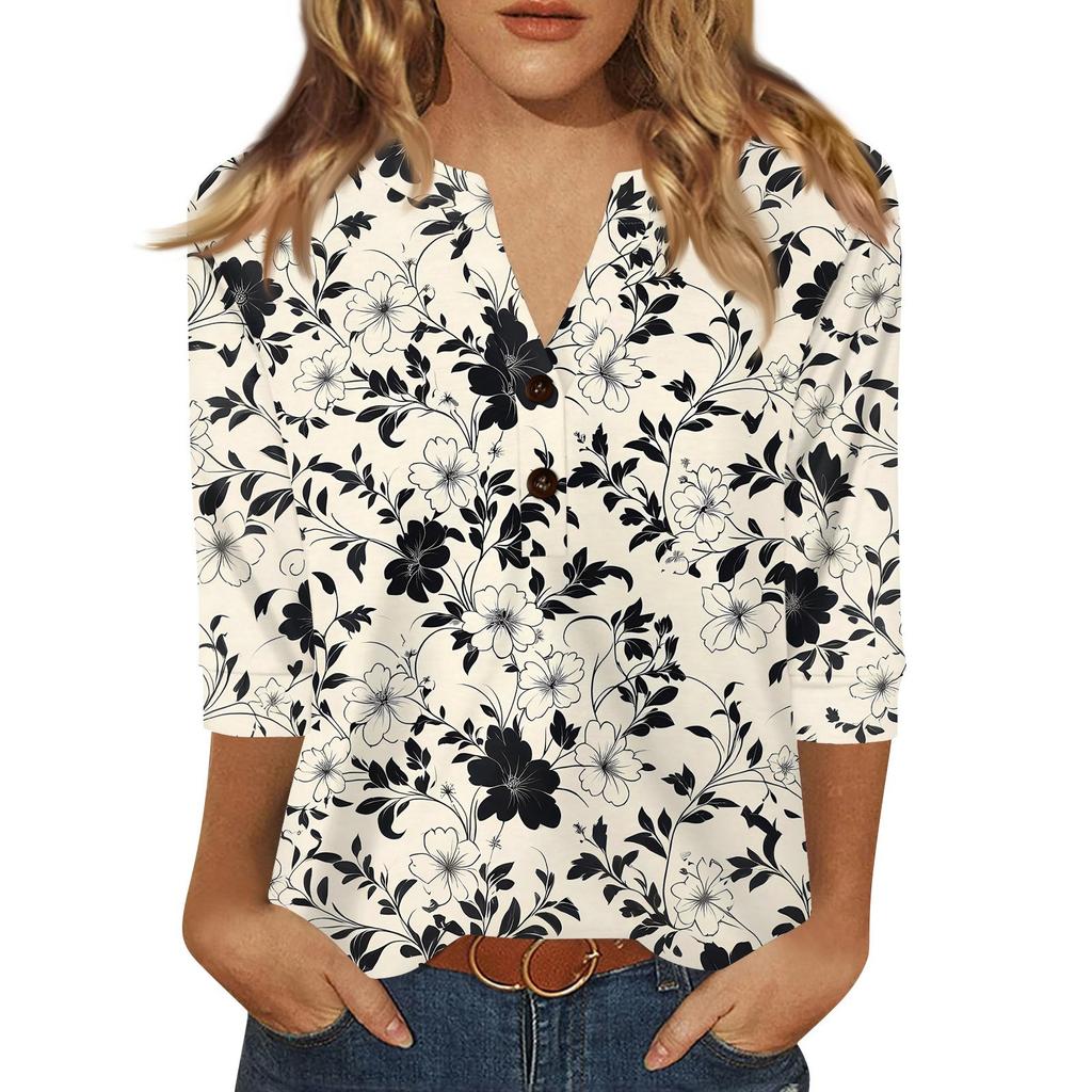Жен. Футболка С принтом Пуговицы Рукав 3/4 Повседневные Выходные Мода Классический Классический V-образный вырез Обычный Верх
