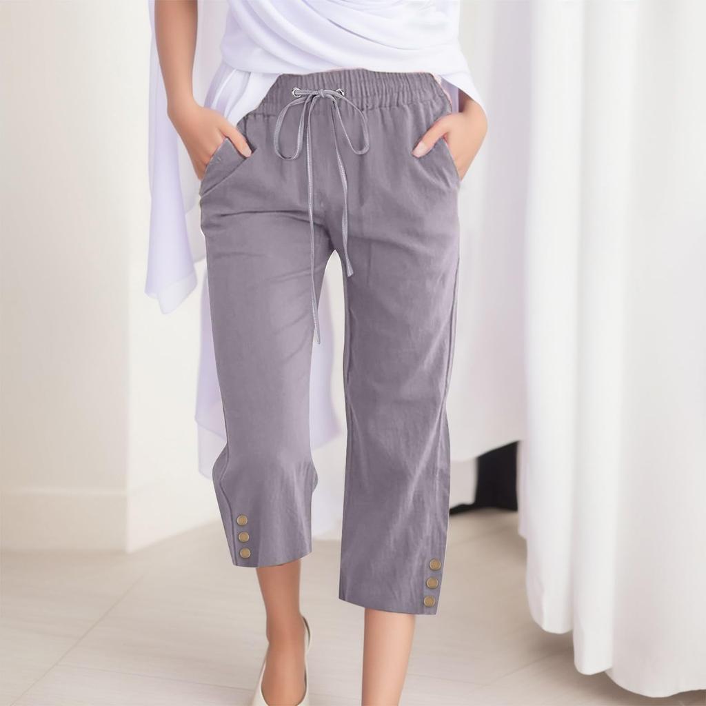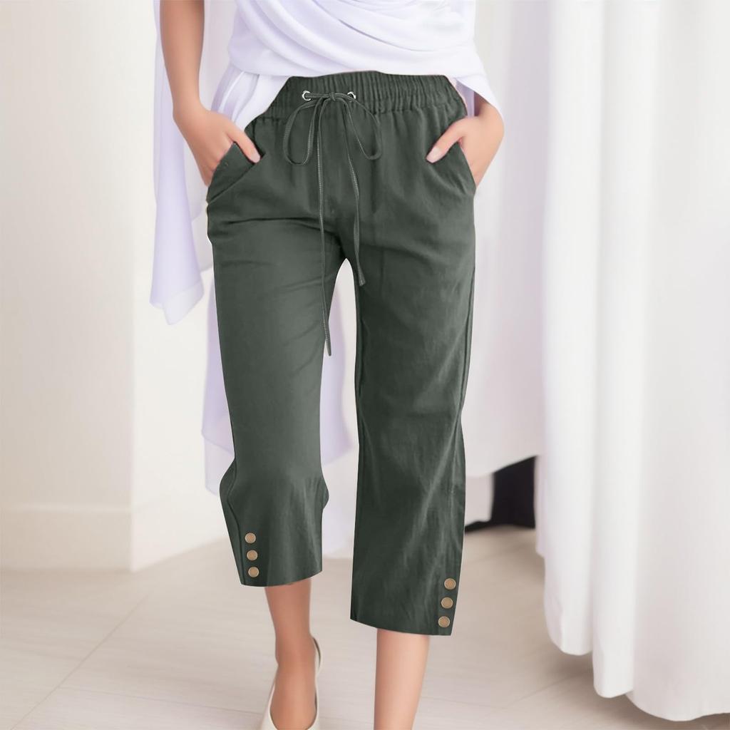 Брюки для женщин, повседневные летние однотонные эластичные брюки с высокой талией из хлопка и льна, свободные брюки с карманами и завязками до середины штанин