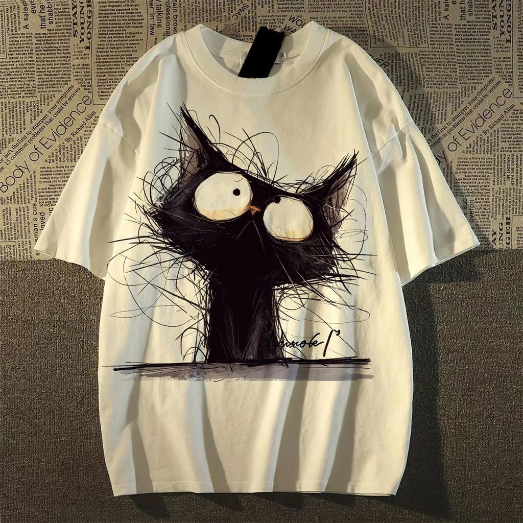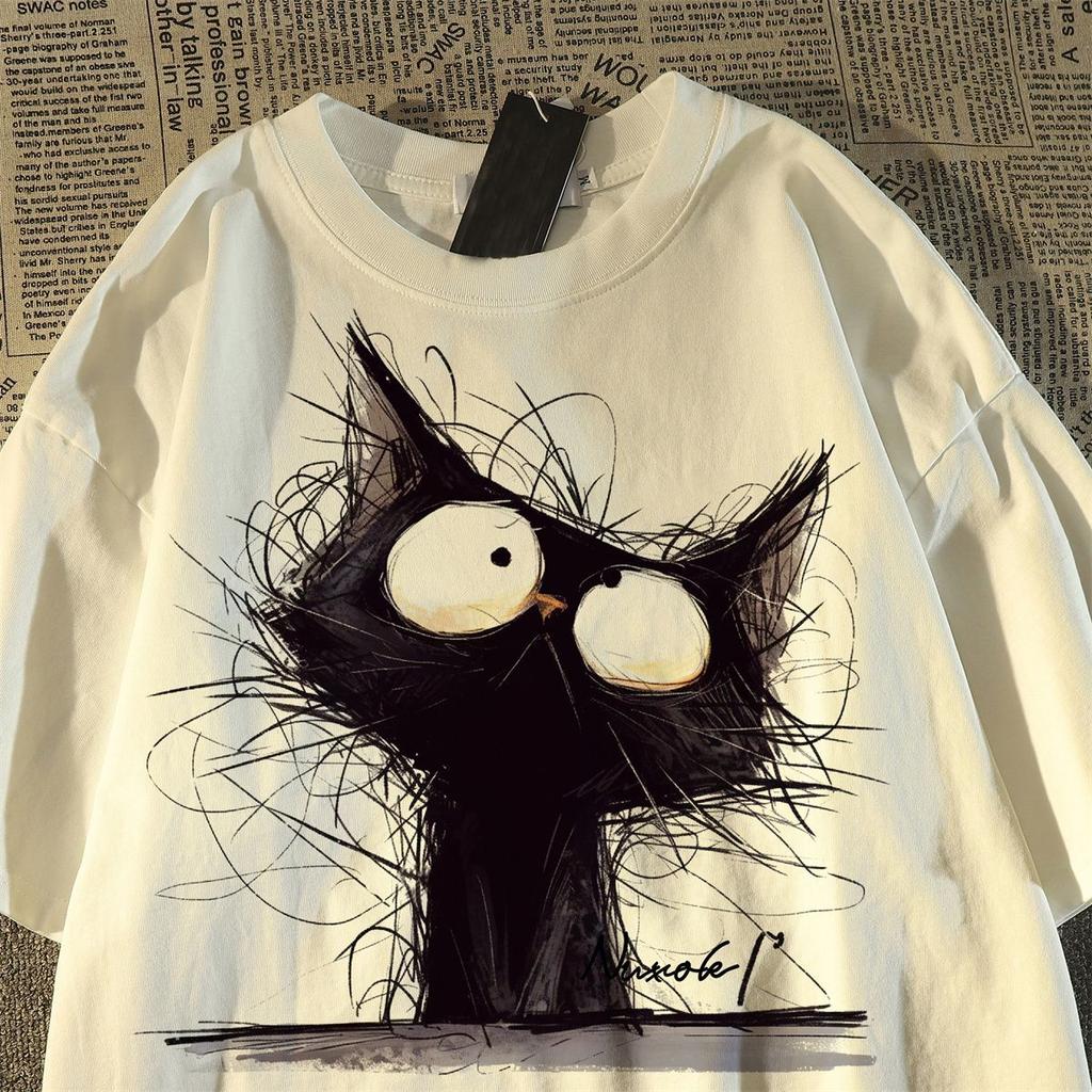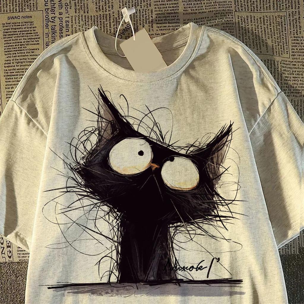 Футболка из хлопка с короткими рукавами для женщин с винтажным принтом в виде кошек, топы на лето