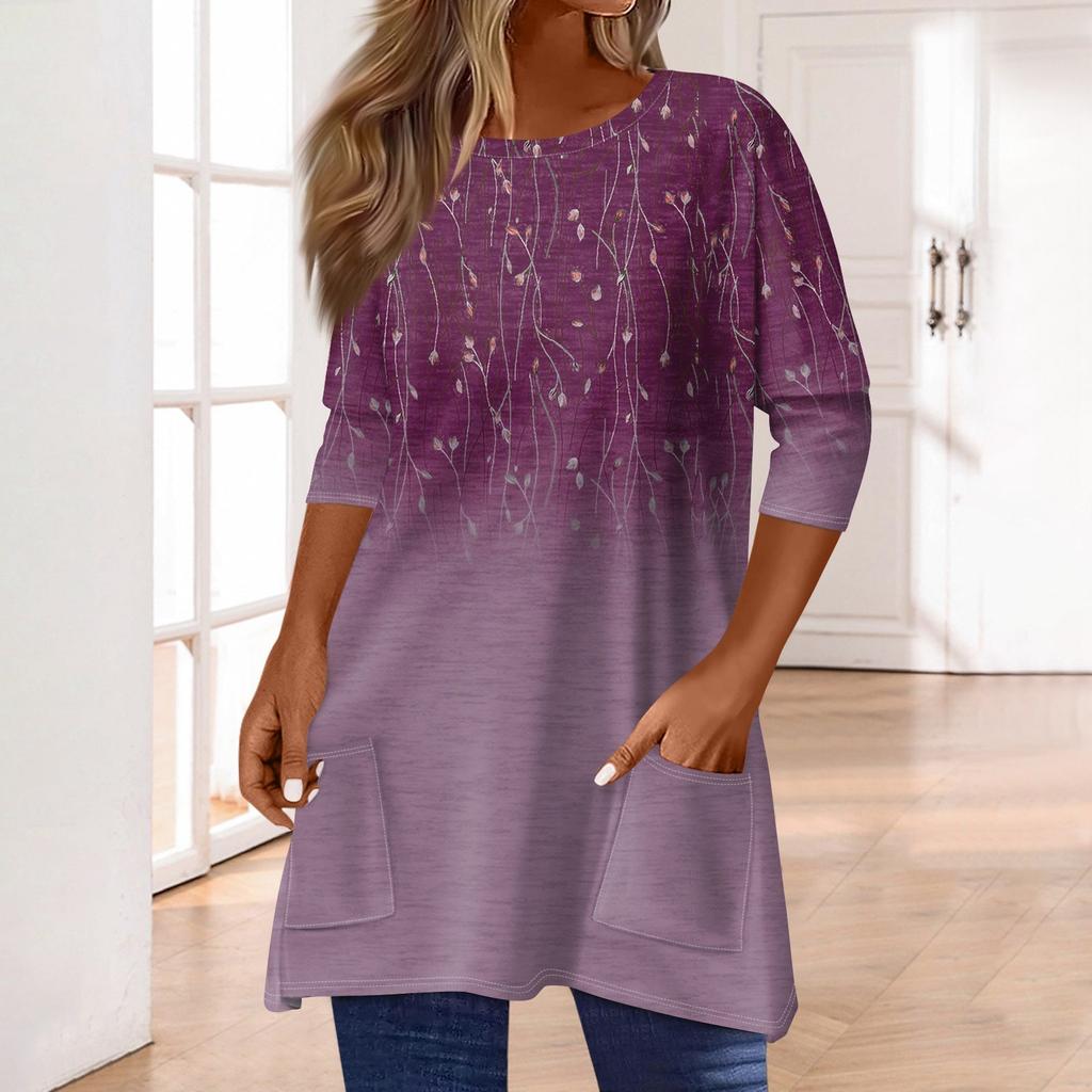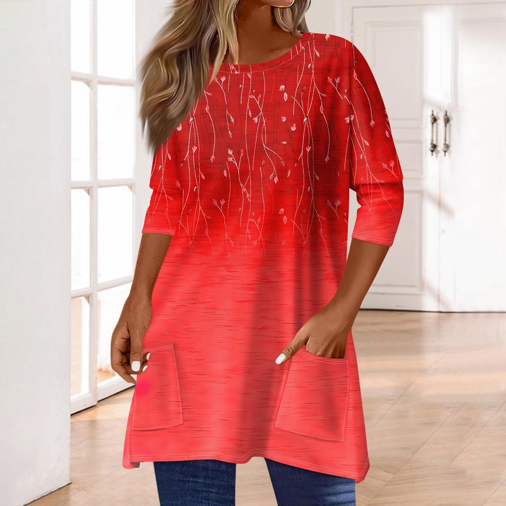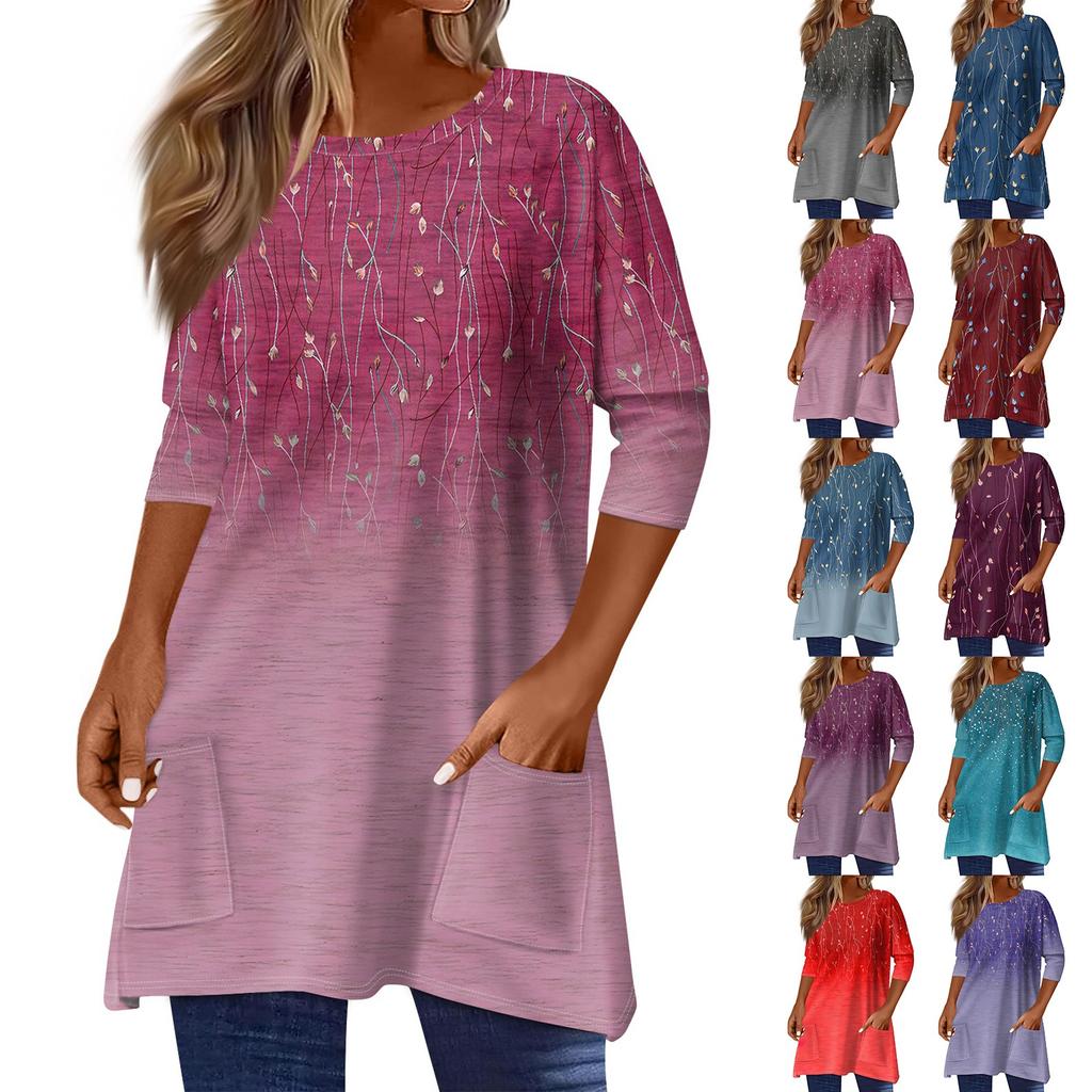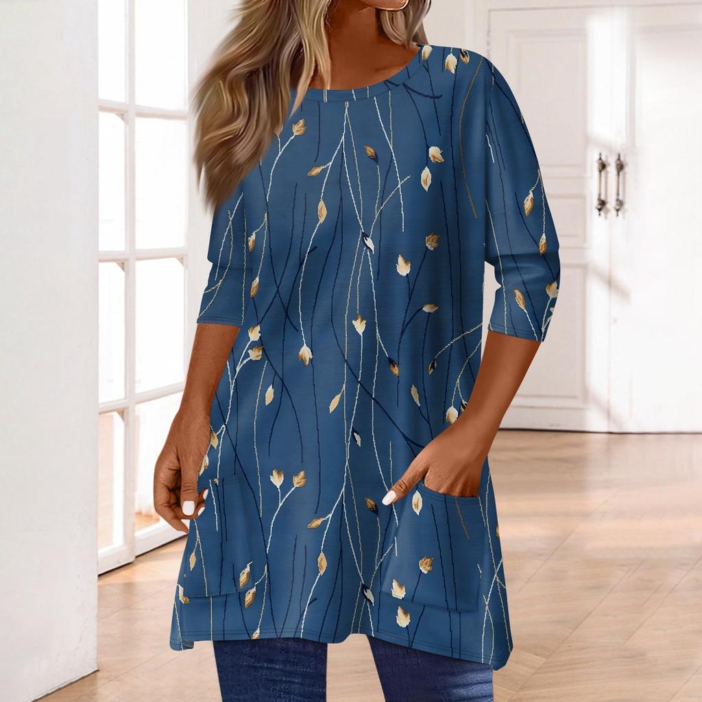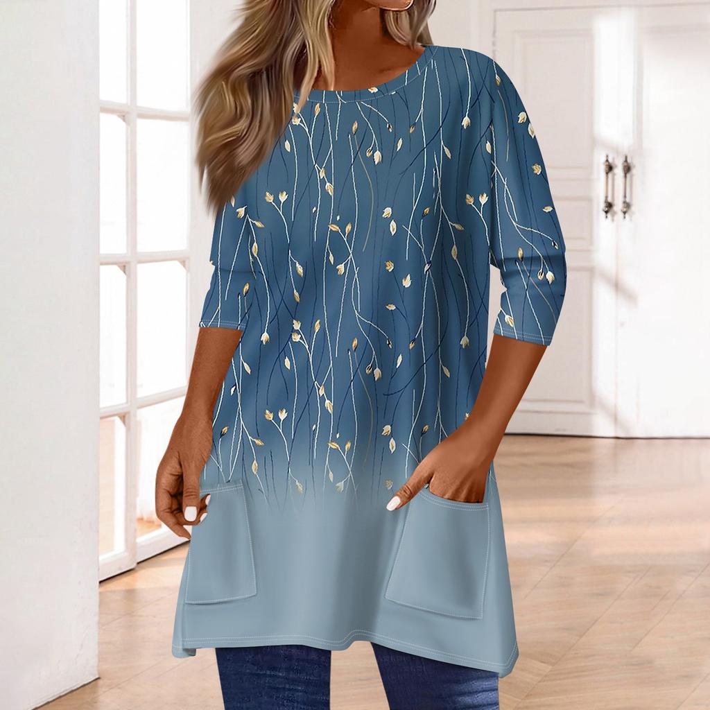 3/4 рукава кармана топы для женщин футболка повседневный принт средней длины топы футболка круглый вырез пуловер блузка
