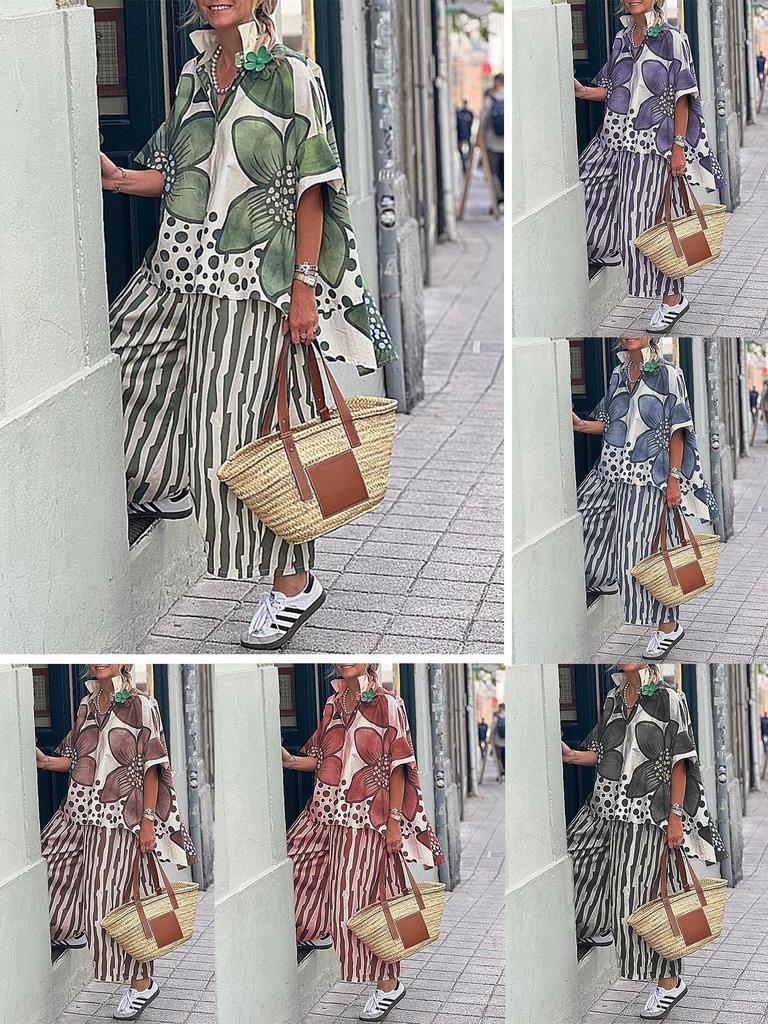 Женский летний комплект из двух частей свободного кроя с цветочным принтом: топ с лацканами и короткими рукавами + брюки с широкими штанинами, повседневный комплект