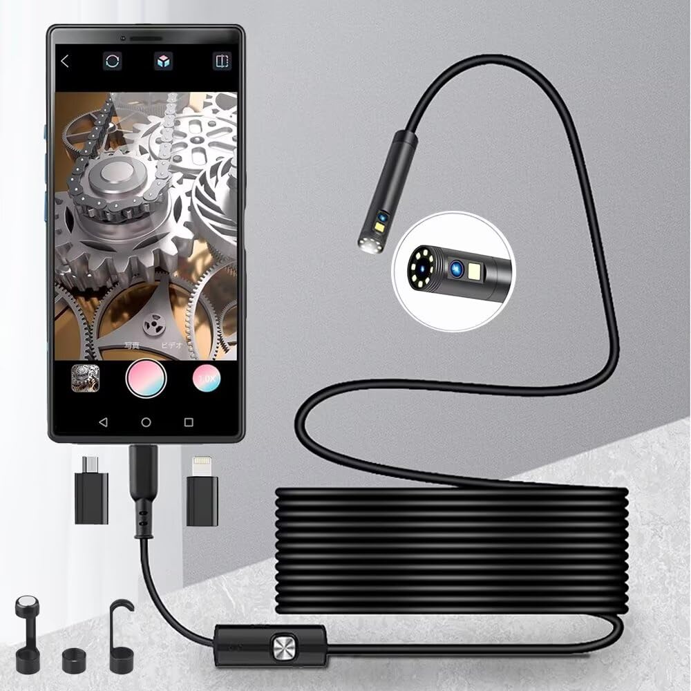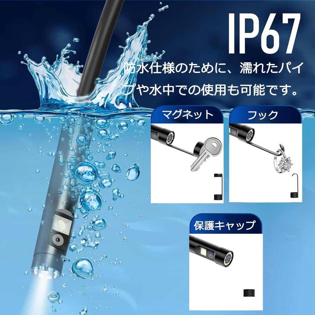 [Водонепроницаемость IP67 и высокая яркость / бесступенчатая регулировка яркости] Оснащен 8 светодиодными лампами на камере и 1 светодиодной лампой сбоку. Кроме того, светодиод высокой яркости с плавной регулировкой яркости обеспечивает четкое изображение даже в темных местах.. Кабель и зонд водонепроницаемы по стандарту IP67, поэтому их можно использовать во влажных трубах и под водой.