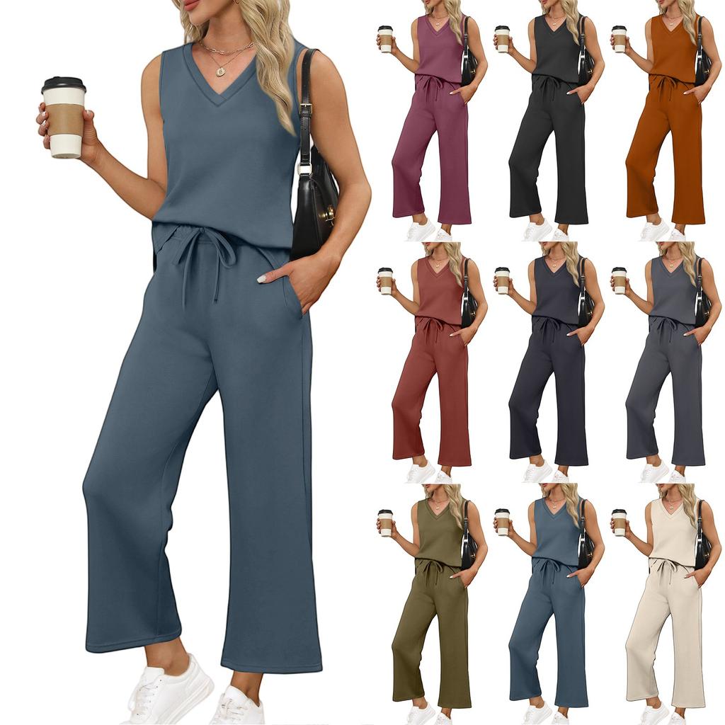 Женский повседневный модный комплект из свободных широких брюк без рукавов с V-образным вырезом