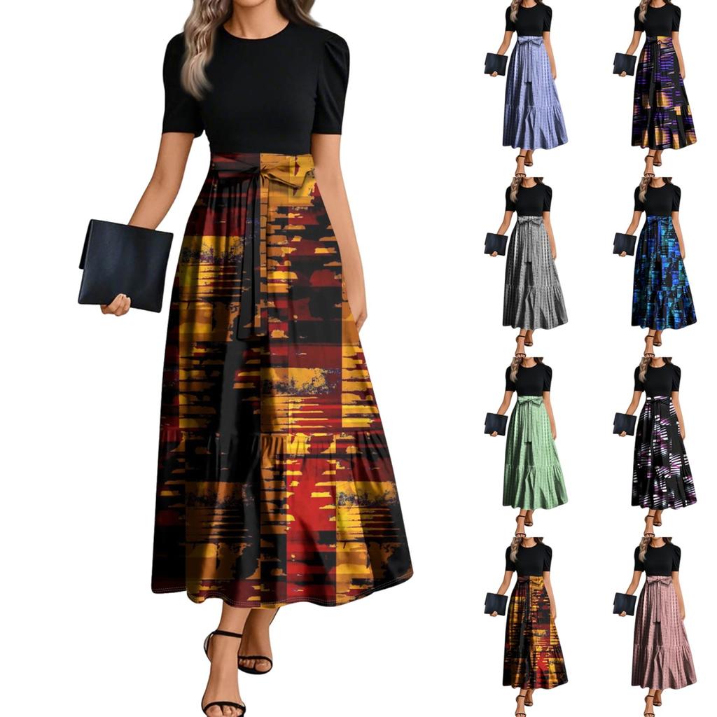 Женские модные повседневные платья с поясом, коротким рукавом, круглым вырезом, геометрическим узором, элегантные платья с темпераментом — купить товар онлайн с бесплатной доставкой по всему миру!