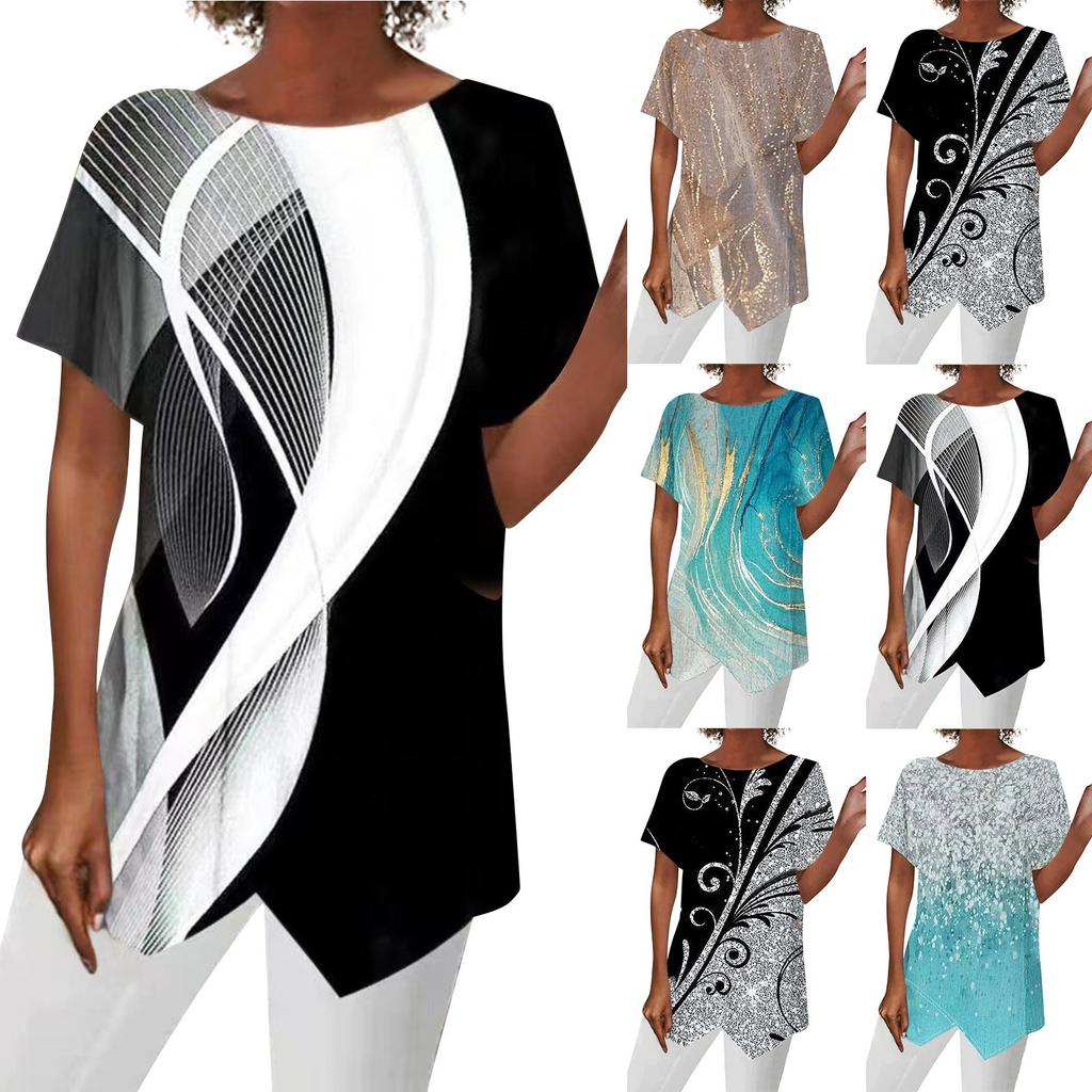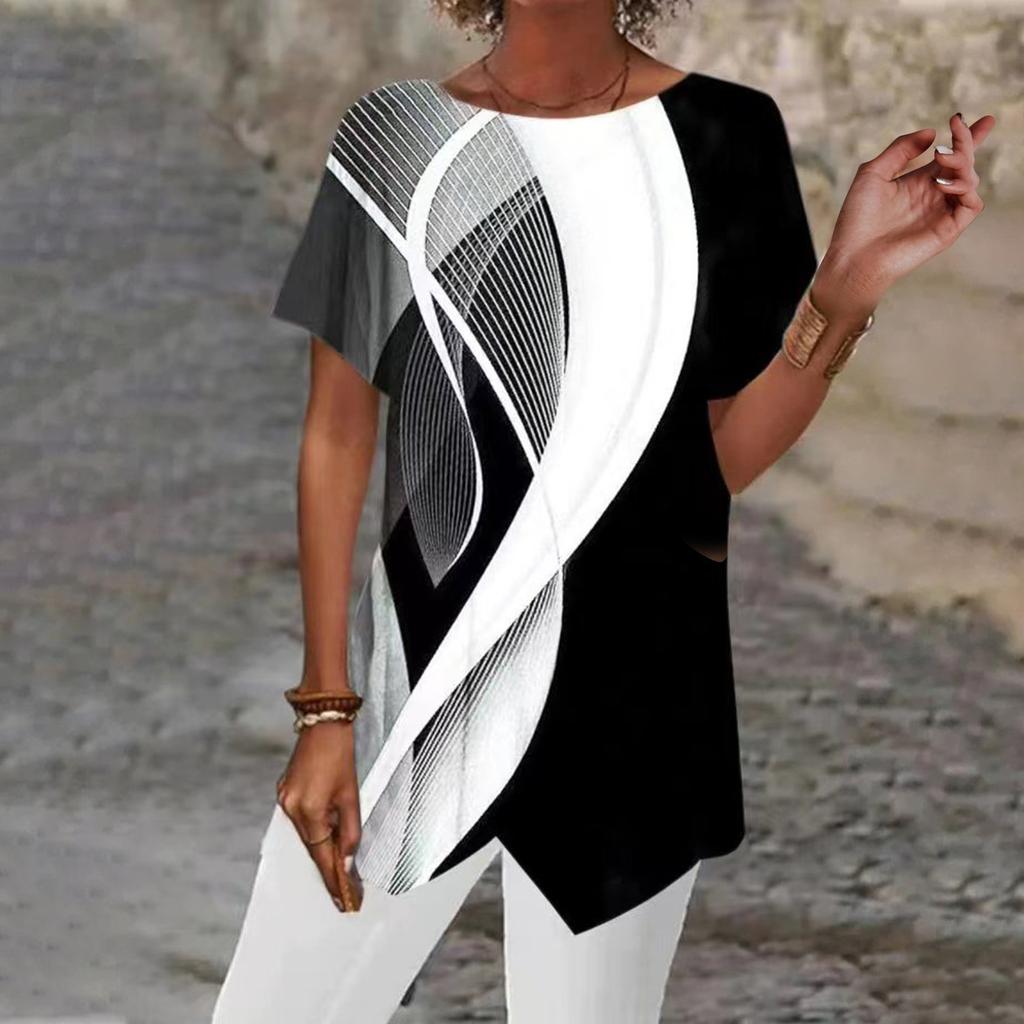 Модная женская летняя свободная футболка с геометрическим принтом и коротким рукавом с нерегулярным подолом