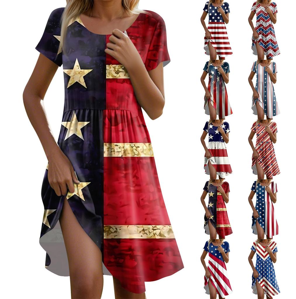 Женское повседневное модное платье миди с круглым вырезом и коротким рукавом с принтом «День независимости»