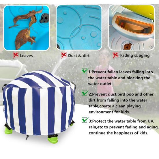 Разработанное для простой установки, телескопическое дно оснащено пряжкой, которая надежно крепится к ножкам стола.. Этот облегающий дизайн предотвращает скопление дождевой воды и влаги, позволяя вашему ребенку продолжить игру сразу после шторма.. Продлите срок службы вашего водного стола, защищая его от солнечного света, дождя, снега, листьев, пыли и грязи.