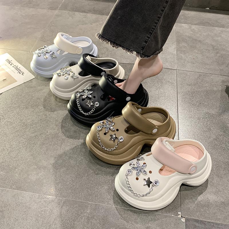 Весна и лето 2025 новые туфли с отверстиями на высокой платформе со стразами женские модные нескользящие на толстой подошве, два варианта носки, тапочки с закрытым носком, женская обувь