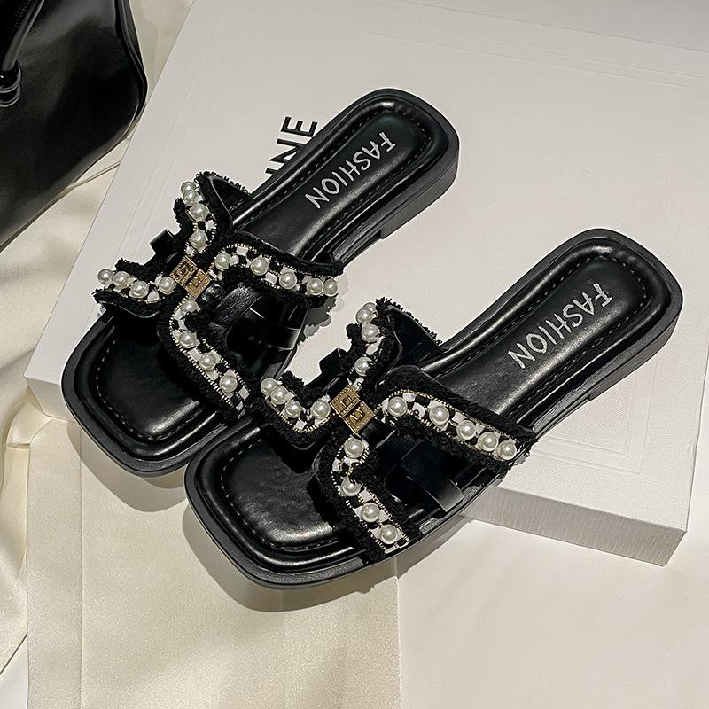Premium sense H slippers women's outer wear 2025 summer new pearl thick bottom round head casual fashion beach slippers women