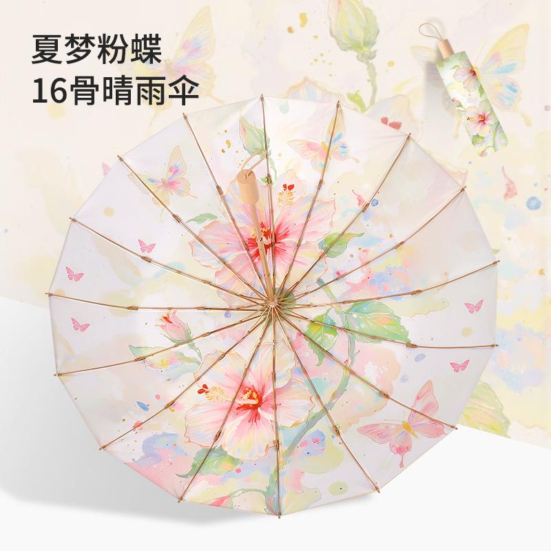 Тройной 16-спицевый ручной зонт от солнца и дождя с цветным клеем и ручкой из массива дерева