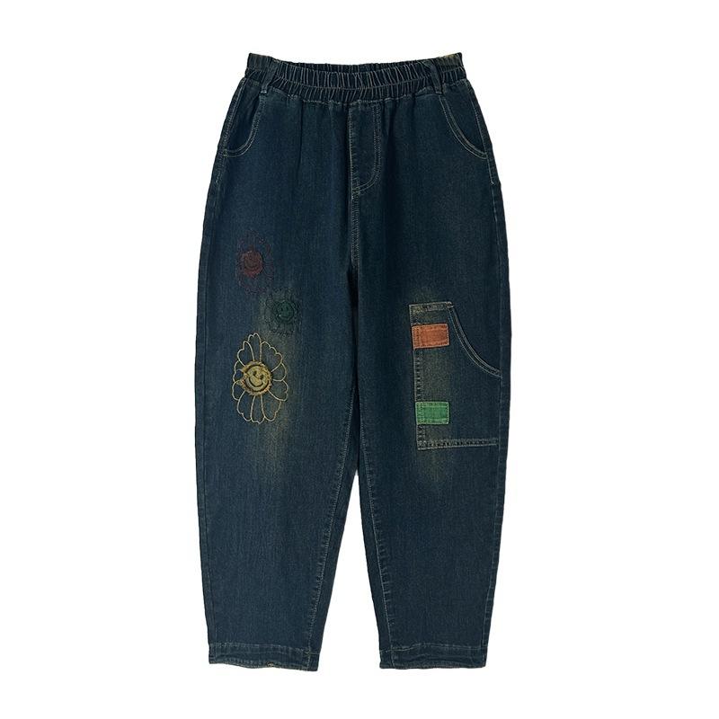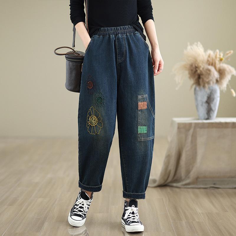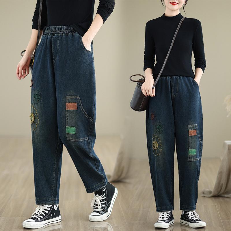 Ретро нашивка вышитые вареные джинсы больших размеров женские осенние стрейч с высокой талией облегающие брюки харлан папины брюки