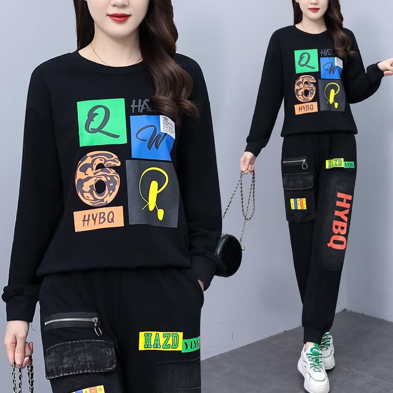 Осенний модный костюм женский корейская версия тонкий и скрывает живот свободный свитер джинсовый двойка большого размера женский