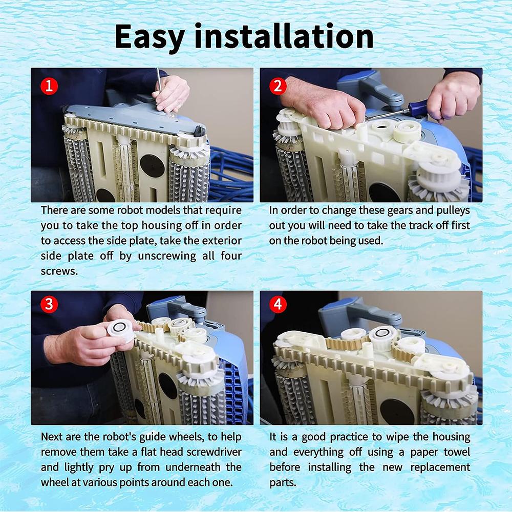 Замена направляющих колес и шкива для робота-пылесоса Dolphin 3884997-R6 Направляющие колеса (4шт) и 2 шт. шкивов для следующих очистителей бассейна. Для поддержания чистоты бассейна и более эффективной работы не требуются сложные инструменты, благодаря нашим запасным частям.
