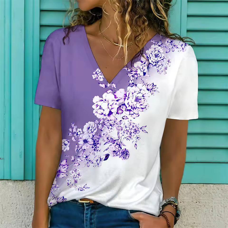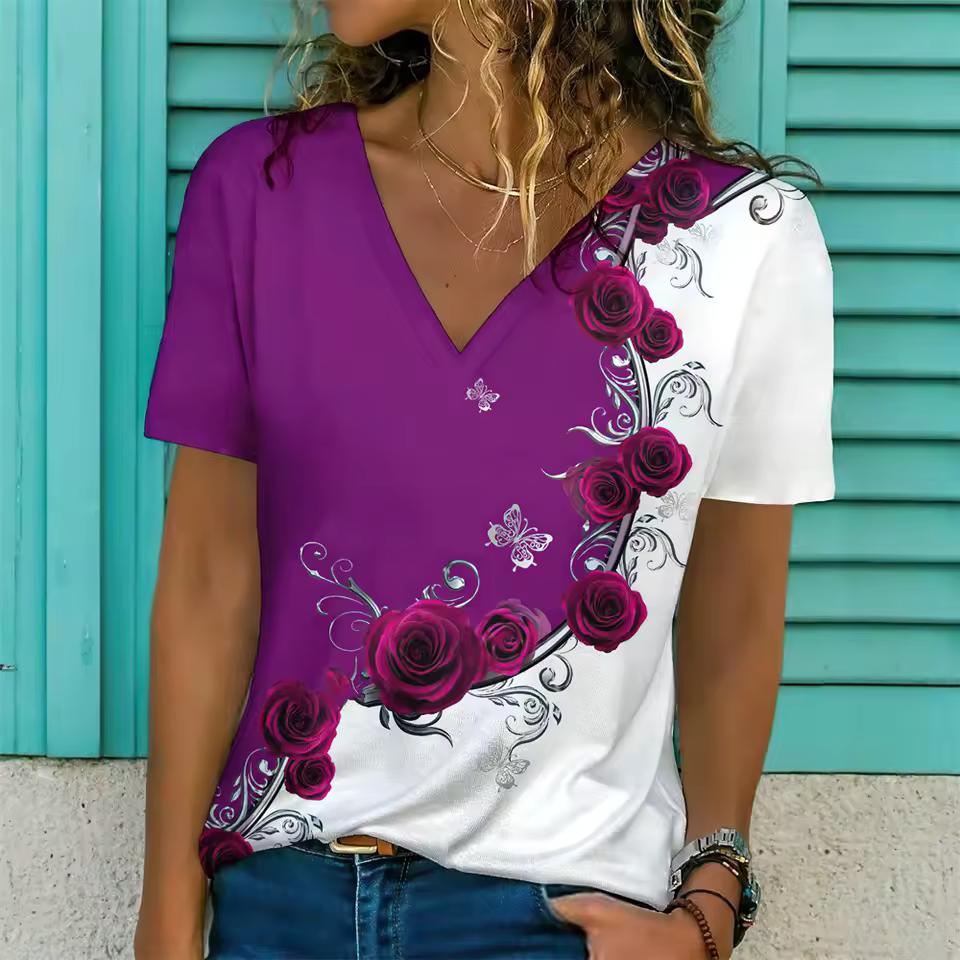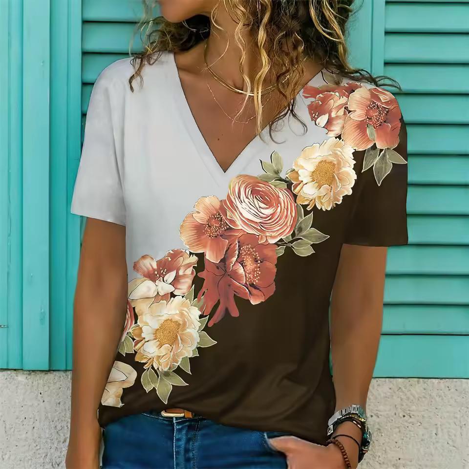 Летний топ с V-образным вырезом, 3D-цветком, цветным блоком и принтом, модные повседневные женские футболки с коротким рукавом