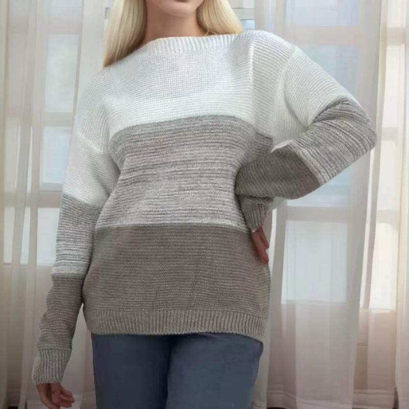 Женский вязаный свитер на осень и зиму, контрастная цветная вставка, круглый вырез, длинный рукав, пуловер