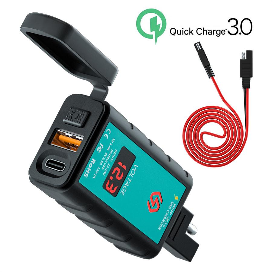 Мотоциклетное USB+Type-C QC3.0 Быстрое зарядное устройство с вольтметром, встроенное гнездо SAE, 1-метровый кабель с двойным гнездом SAE, 12-24В