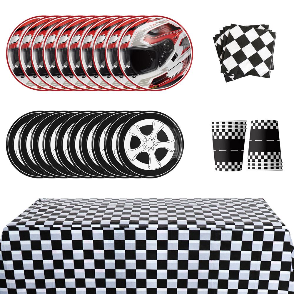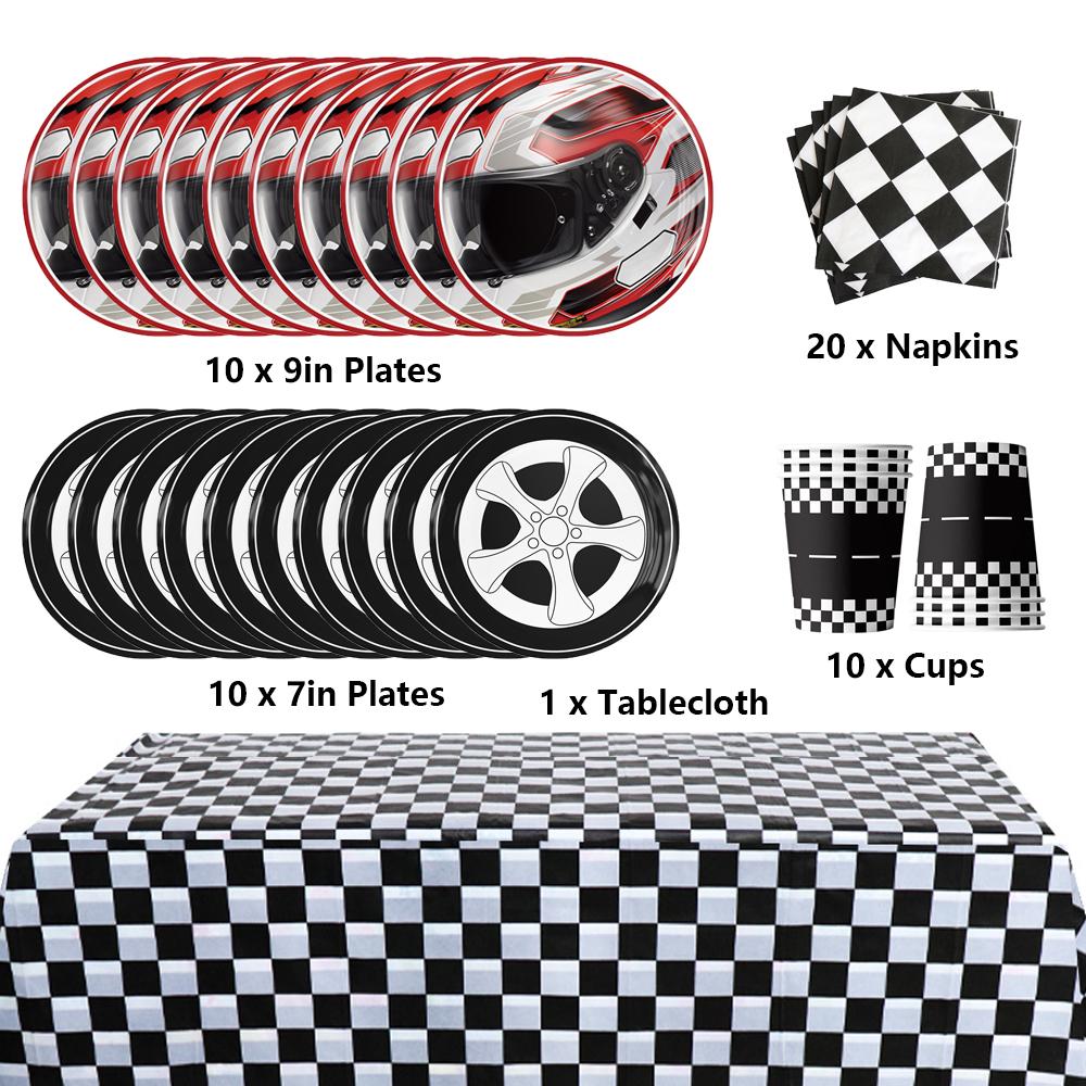 Новый набор посуды для гоночной машины из 51 предмета включает тарелки, салфетки и чашки, скатерть