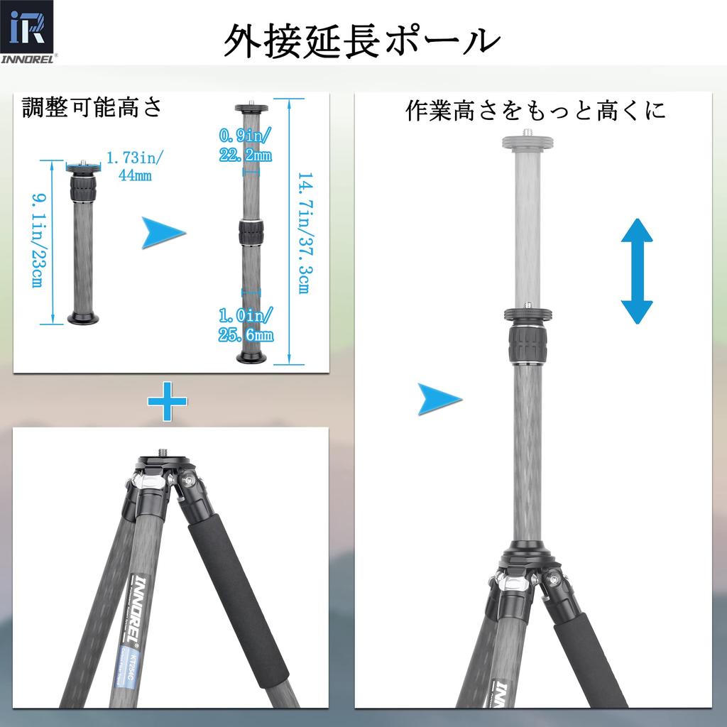 [С удлинительной центральной штангой] Этот карбоновый штативный комплект поставляется с одной карбоновой удлинительной центральной штангой. При установке этой удлинительной штанги рабочая высота может быть свободно установлена до максимума 157,8 см, а при установке головки и оборудования максимальная рабочая высота может достигать 177,5 см или более.. Этот компактный штатив сочетает в себе отличную универсальность и удобство.