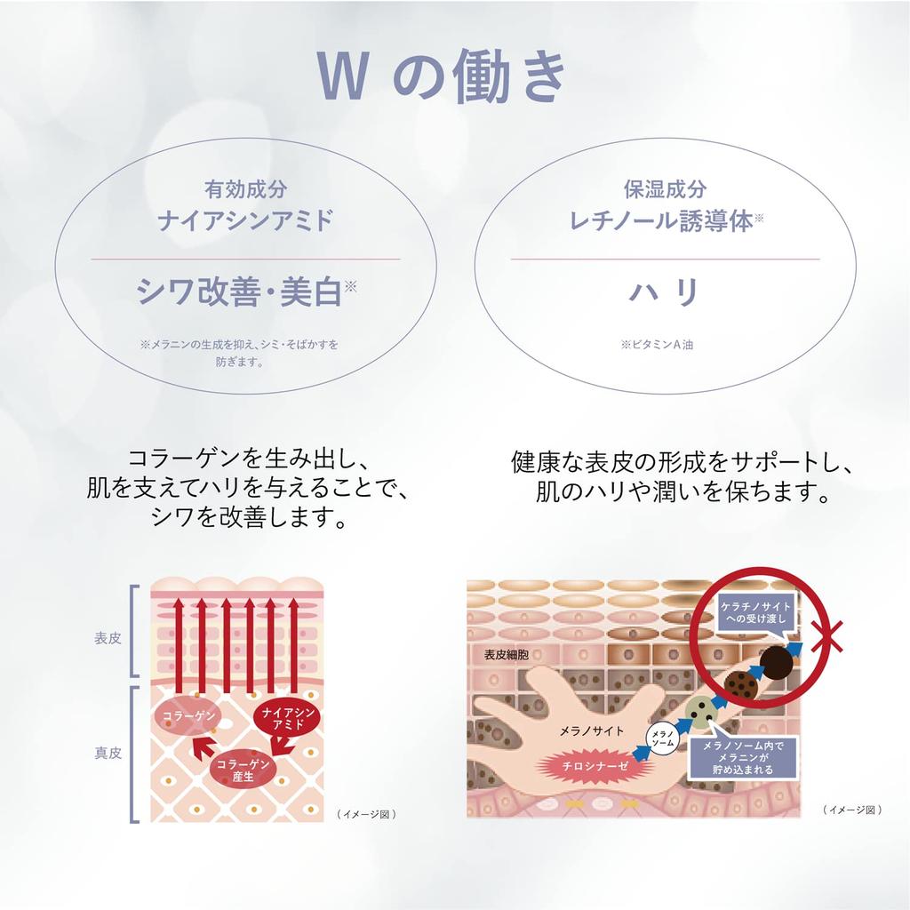 Содержит производное ретинола (масло витамина А), bri эластин, укрепляющий пептид*1, три типа человеческого церамида*2 и низкомолекулярная гиалуроновая кислота*3 (увлажняющие ингредиенты)*1 Коллагеновый трипептид F*2 N-стеароил дигидросфингозин, N-стеароил фитосфингозин, гидроксистеарил фитосфингозин*3 Гидролизованная гиалуроновая кислота