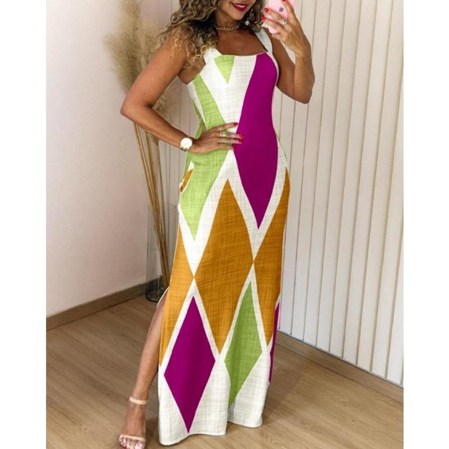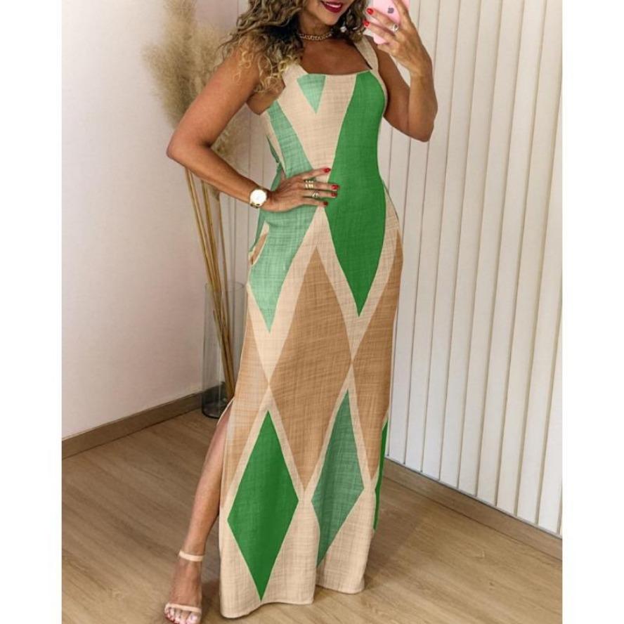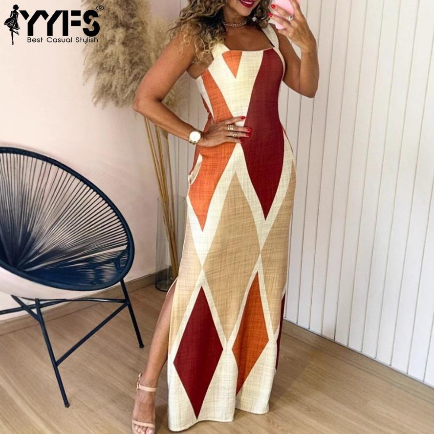 YYFS Женская мода лето весна цвет блок принт без рукавов квадратный воротник высокая талия повседневные платья