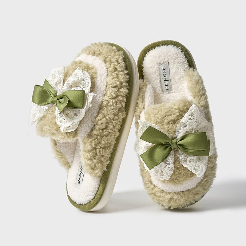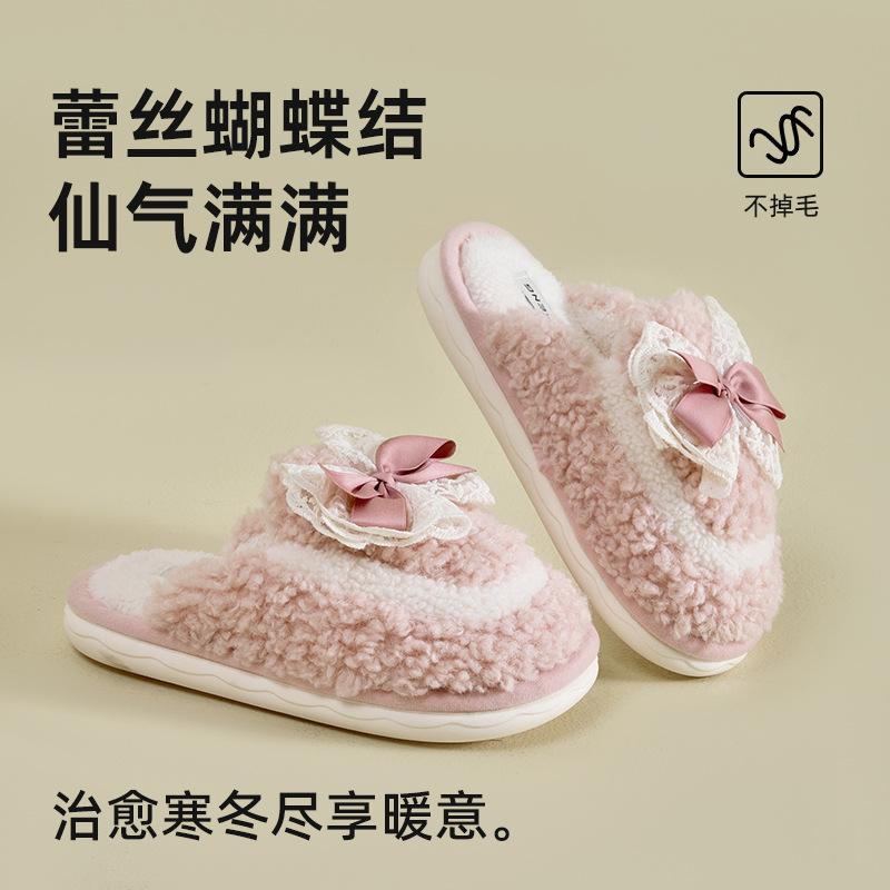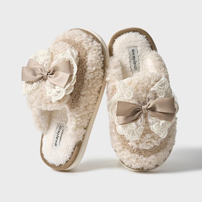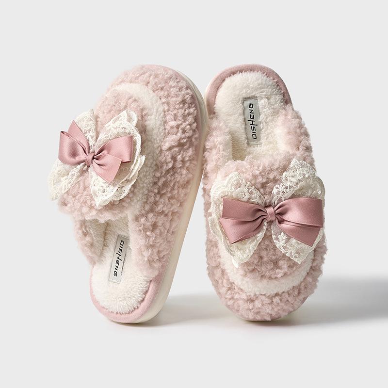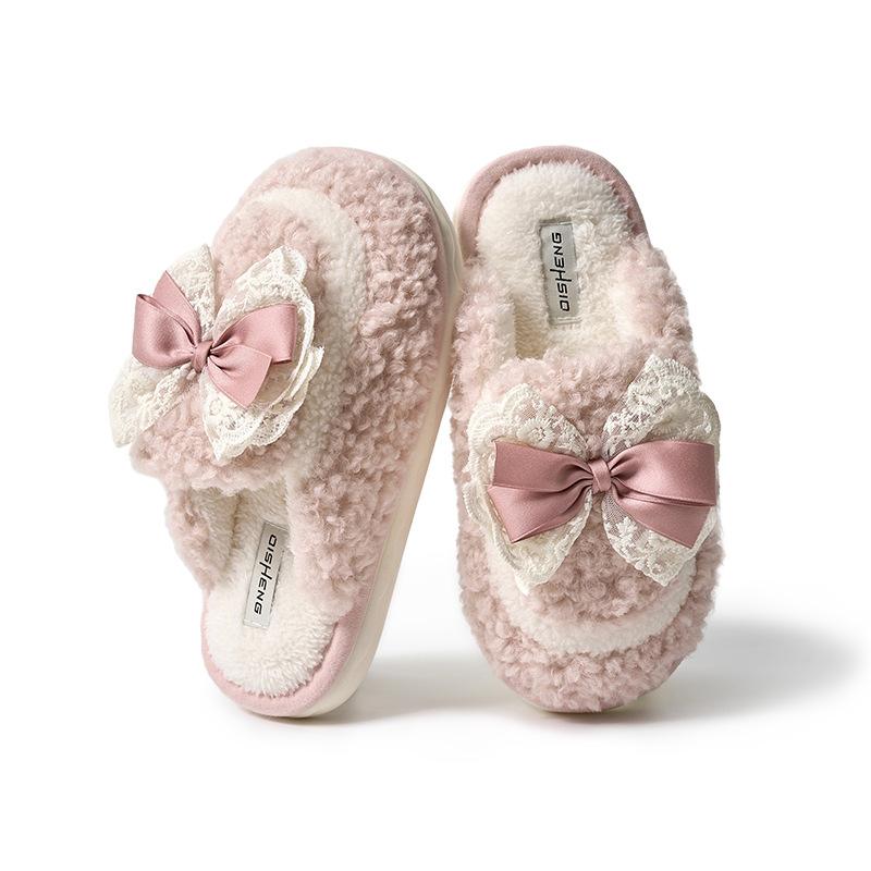 Плюшевые тапочки с кружевным бантом, новые осенне-зимние, домашние, нескользящие, теплые, с чувством стиля, можно носить на улице, хлопковые тапочки на толстой подошве
