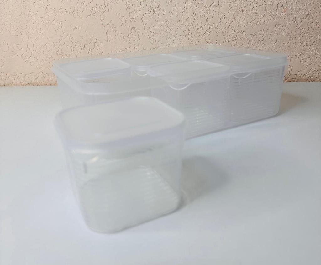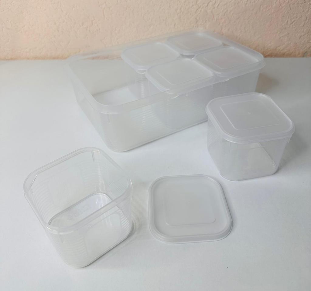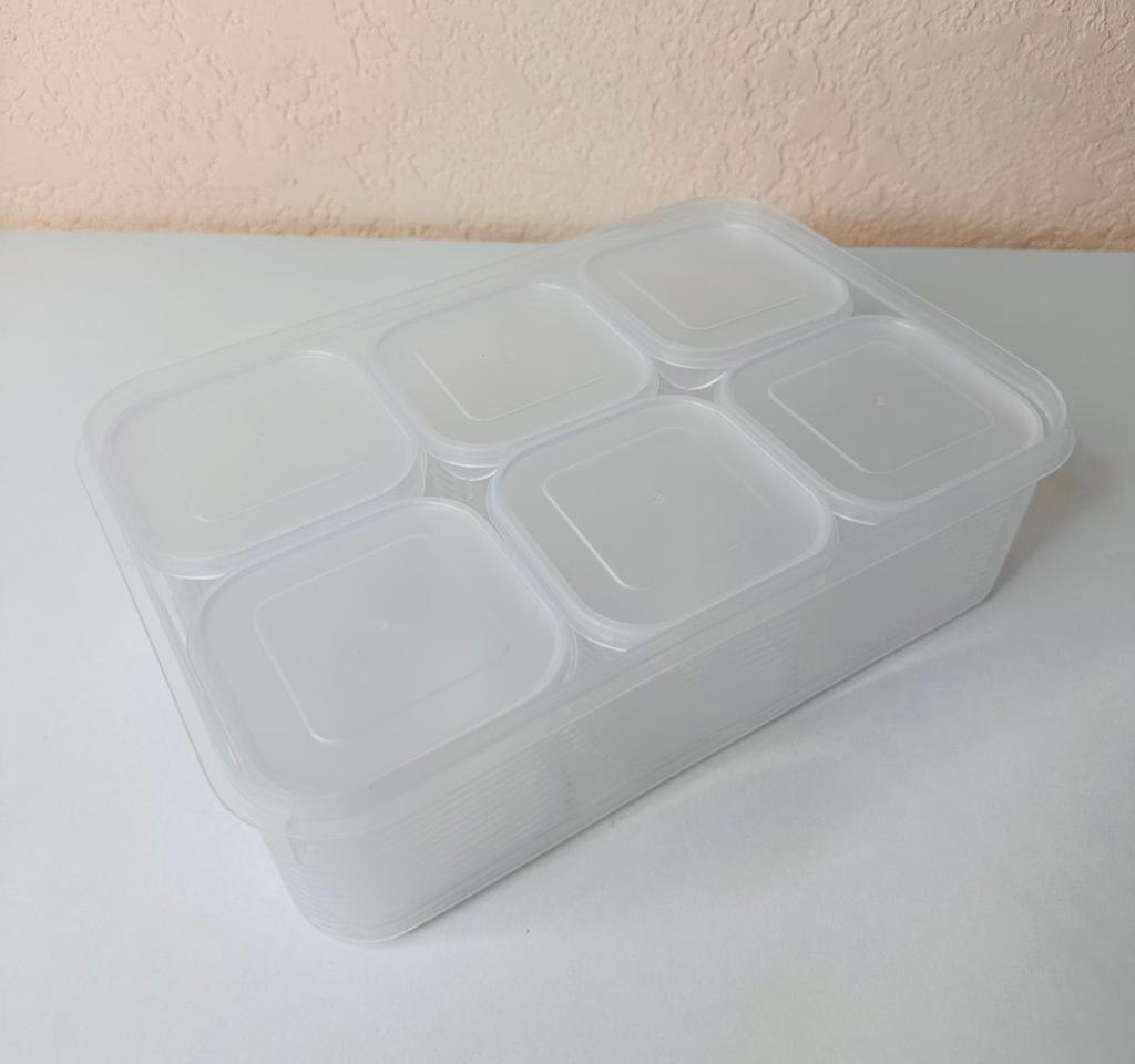 Набор контейнеров для заморозки, хранения продуктов в холодильнике, морозильной камере. В наборе идёт 6 контейнеров, объёмом - 300мл. Все контейнеры закрываются герметично крышками, плюс все они находятся в одном большом контейнере, который тоже закрывается крышкой. Контейнеры изготовлены из безопасного пищевого пластика, устойчивого к низким температурам, что обеспечивает длительное хранения. В таких контейнерах хорошо замораживать небольшие порции ягод, овощей, зелени, готовых блюд или соусов. Пришел набор хорошо упакован, без постороннего запаха. Заказом довольная на 5+ Рекомендую!