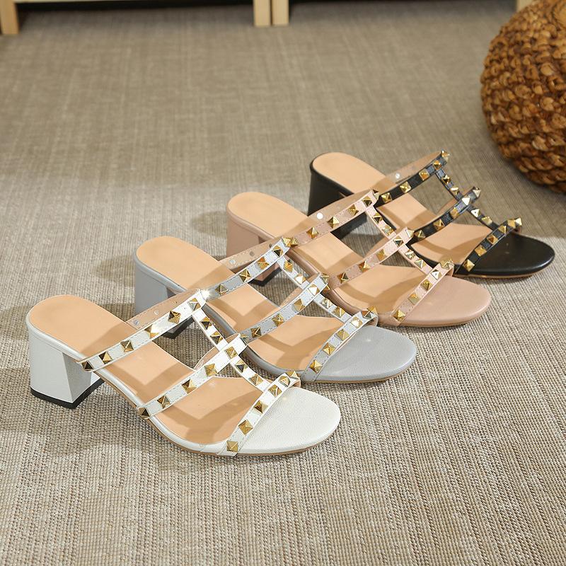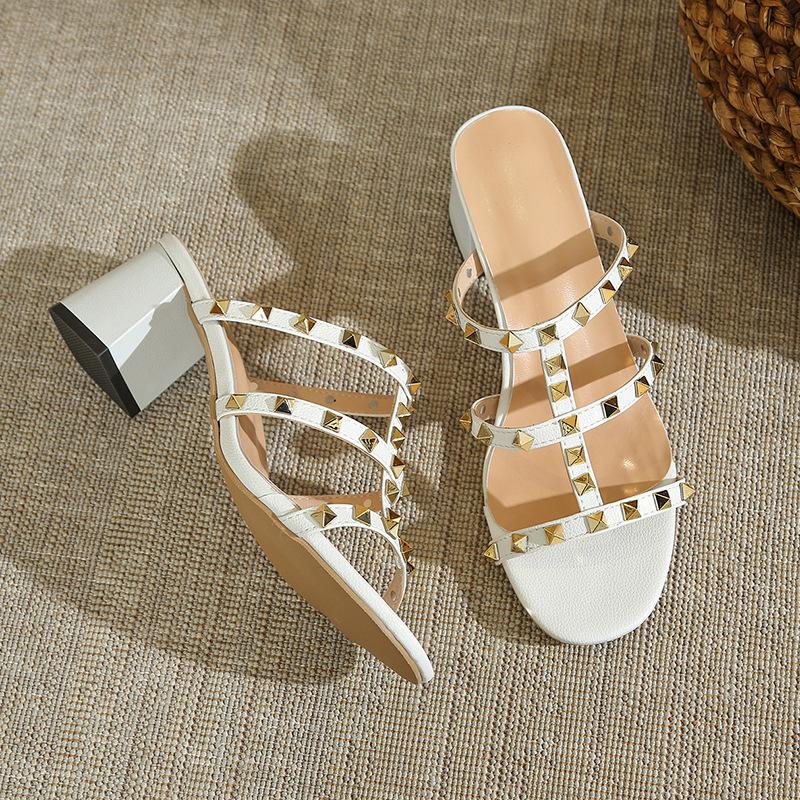 Сексуальные полушлепанцы на среднем толстом каблуке с заклепками, женские, 2025, новая летняя обувь, универсальные туфли на высоком каблуке, универсальные крутые шлепанцы
