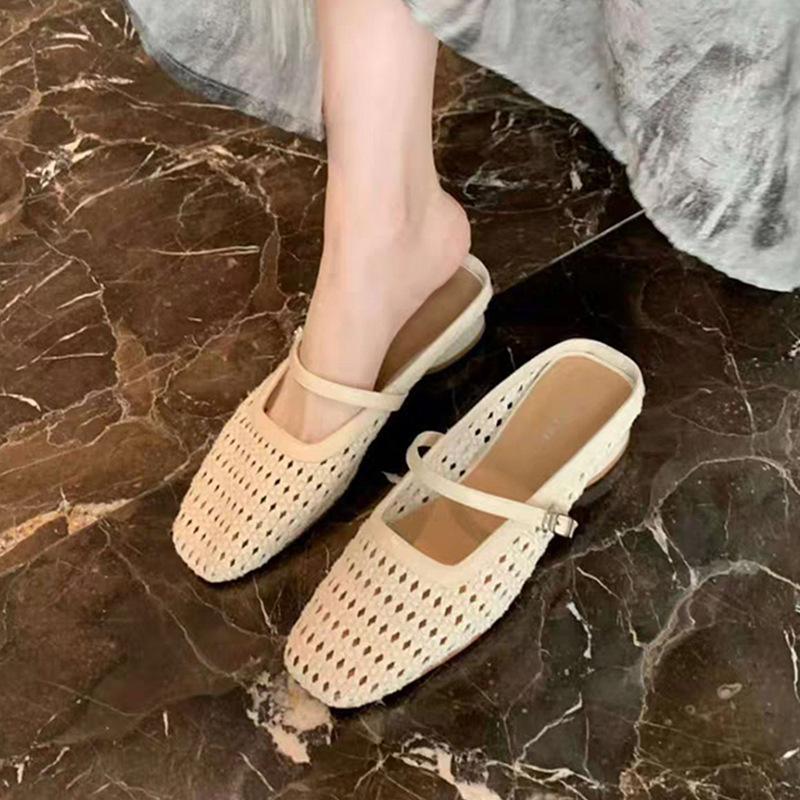 Ретро плетеный толстый каблук с полушлепками для женской летней коллекции 2025 года, новая уличная обувь и крутые шлепки на скрытой платформе