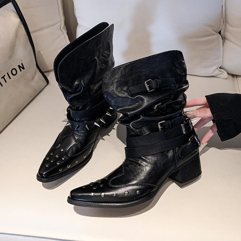 Заостренные плиссированные ковбойские сапоги женские большого размера V-образный вырез толстый каблук наборные сапоги Martin сапоги с пряжкой на ремне заклепки рыцарские сапоги