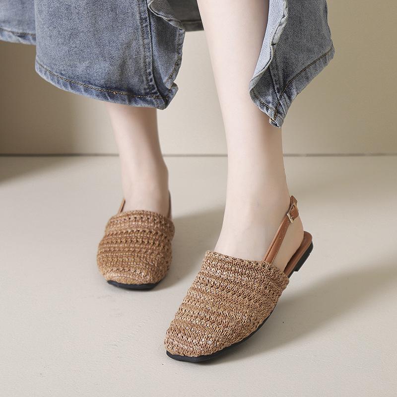 Соломенная плетеная сумка на толстом каблуке и с неглубоким вырезом, сандалии с открытой пяткой, женская обувь, весна-лето 2025, новые сандалии на плоской подошве с одним ремешком — купить товар онлайн с бесплатной доставкой до всему миру!