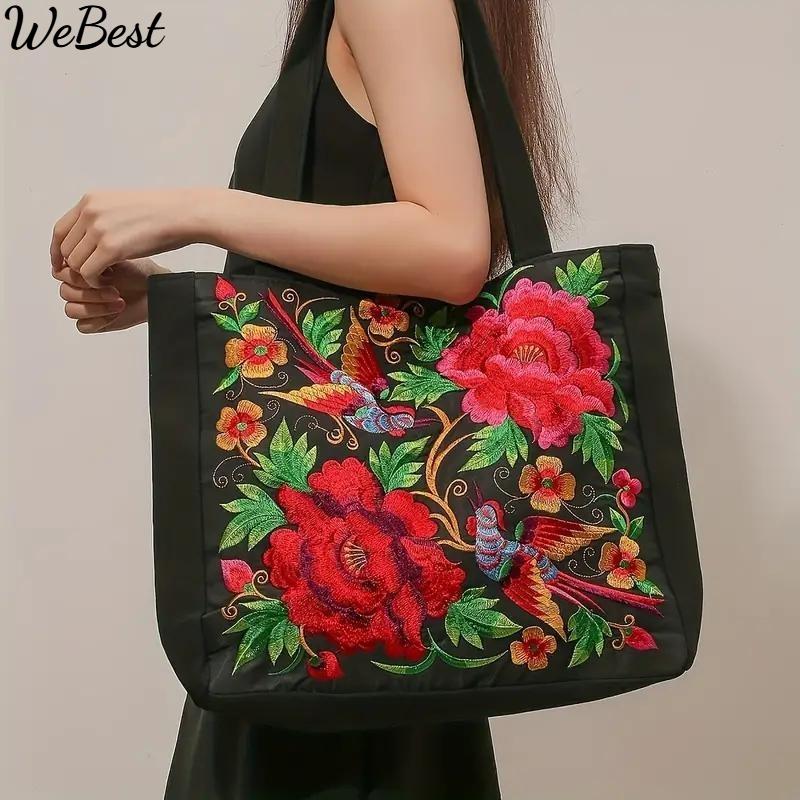 Сумка-тоут из холста с цветочной вышивкой, сумка через плечо в этническом стиле, сумка большой емкости для женщин — купить товар онлайн с бесплатной доставкой по всему миру!